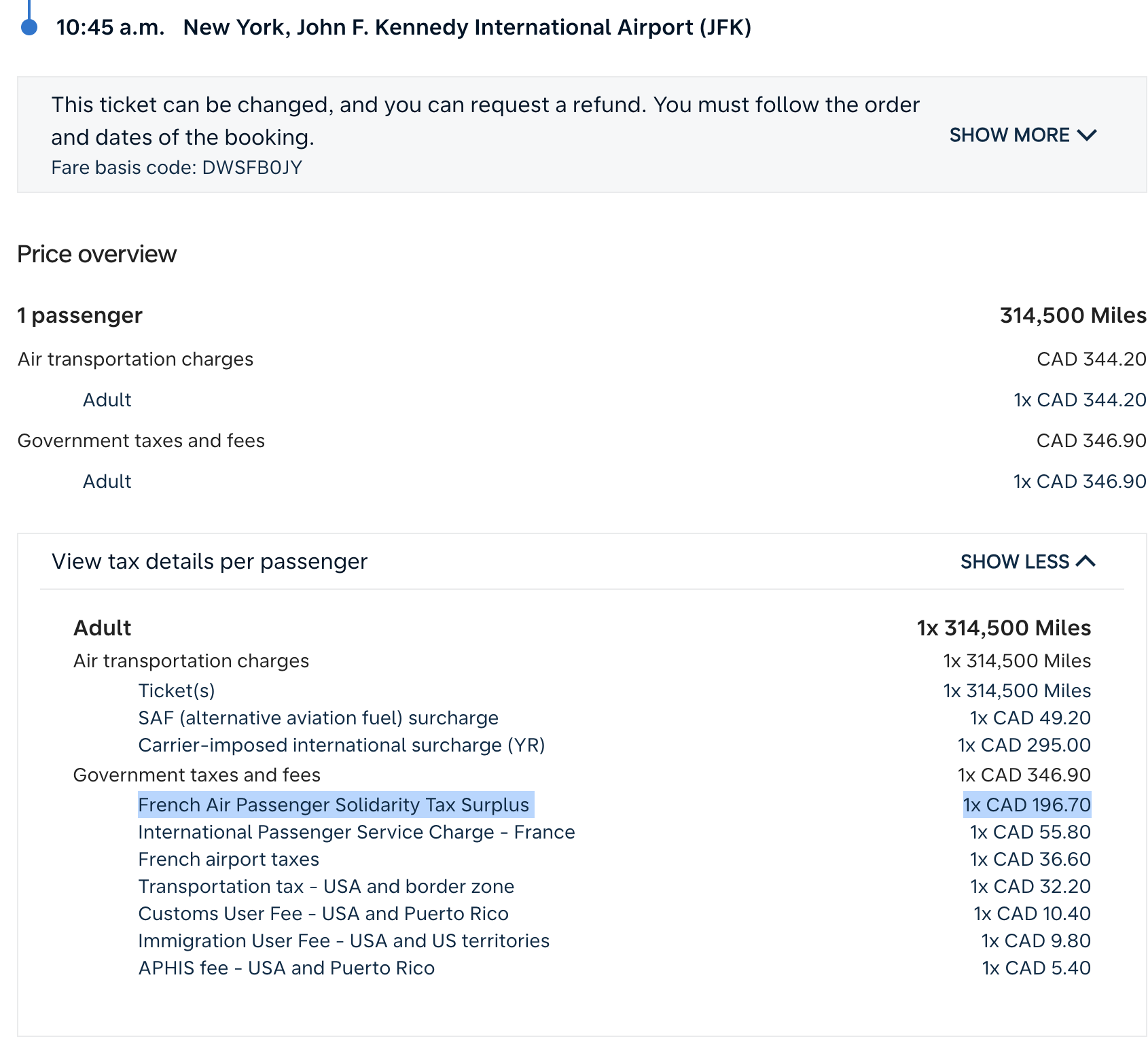 | Departure | Arrival | YQ (CAD) | Gov-imposed tax (CAD) |