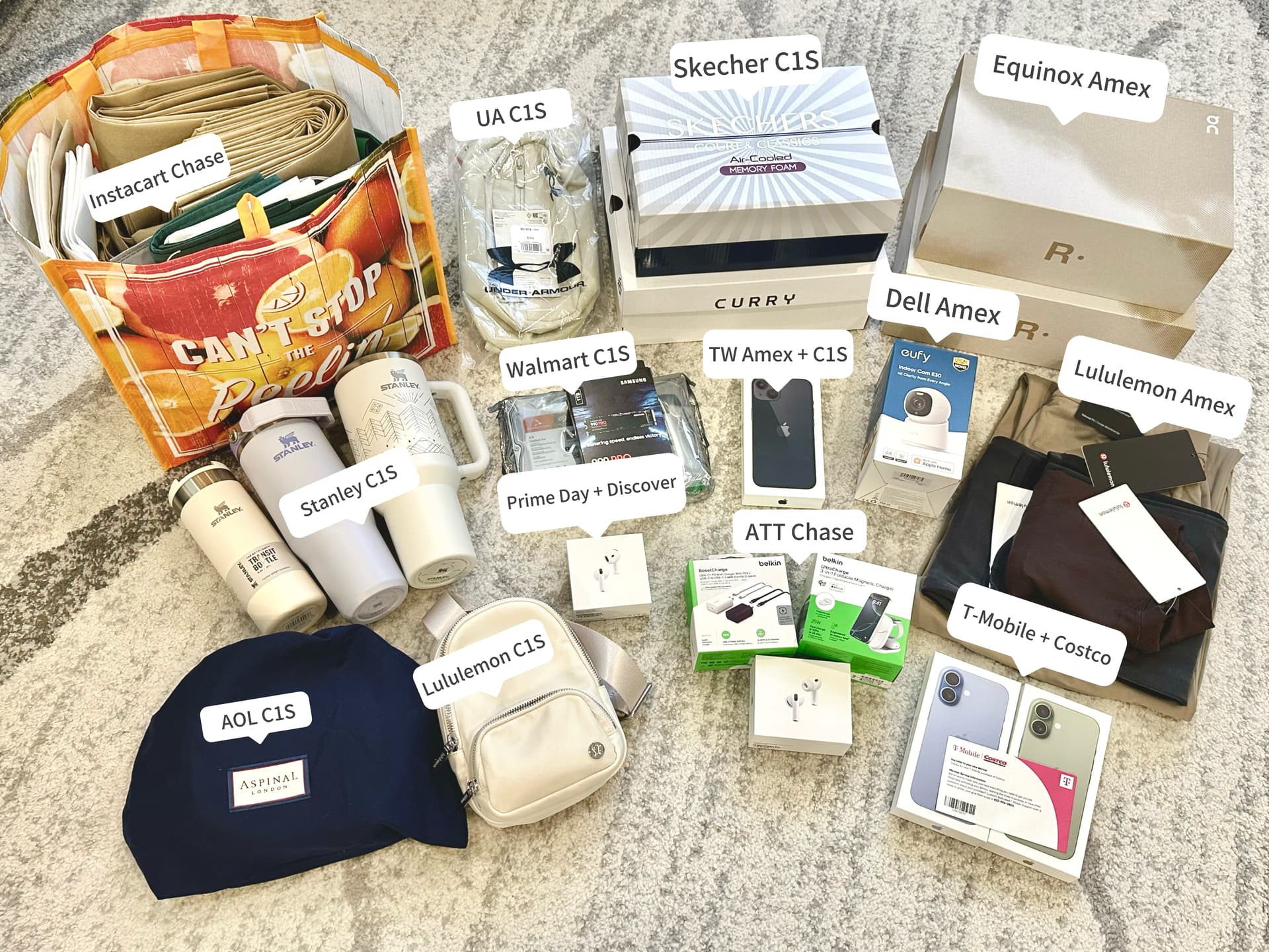 Lululemon (Amex 上季度实体店$75礼卡,加拿大用因为汇率相当于再打7折; 本季度美国官网 C1S 返20%)
