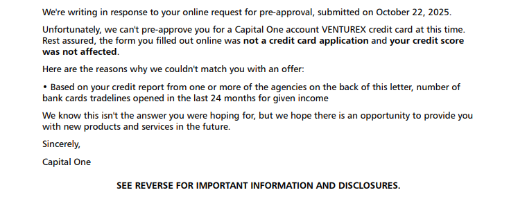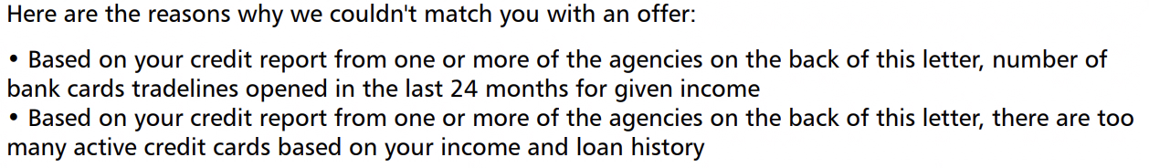 Based on your credit report from one or more of the agencies on the back of this letter, there are too many active credit cards based on your income and loan history