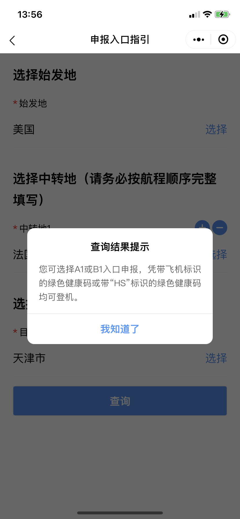 有个技术问题:如果从A过出发,经B国专机回到中国,驻A国领馆尚未公布认证检测机构,但是B国已经实施该政策,是否这条转机线路就不可能成行了?(微信小程序测试过出发地美国,中转俄罗斯,目的地上海,系统要求按照B路径填报)