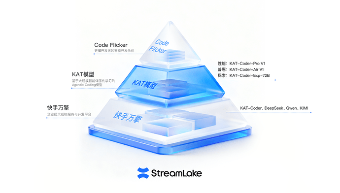 快手 StreamLake 今天宣布推出“工具 + 模型 + 平台”三位一体 AI 编程产品矩阵,包括智能开发工具 CodeFlicker、多个自研大模型 KAT-Coder 以及大模型平台快手万擎(Vanchin),为企业与开发者构建 AI 编程新生态。其中 KAT-Coder-AirV1 版本将面向所有用户免费使用。