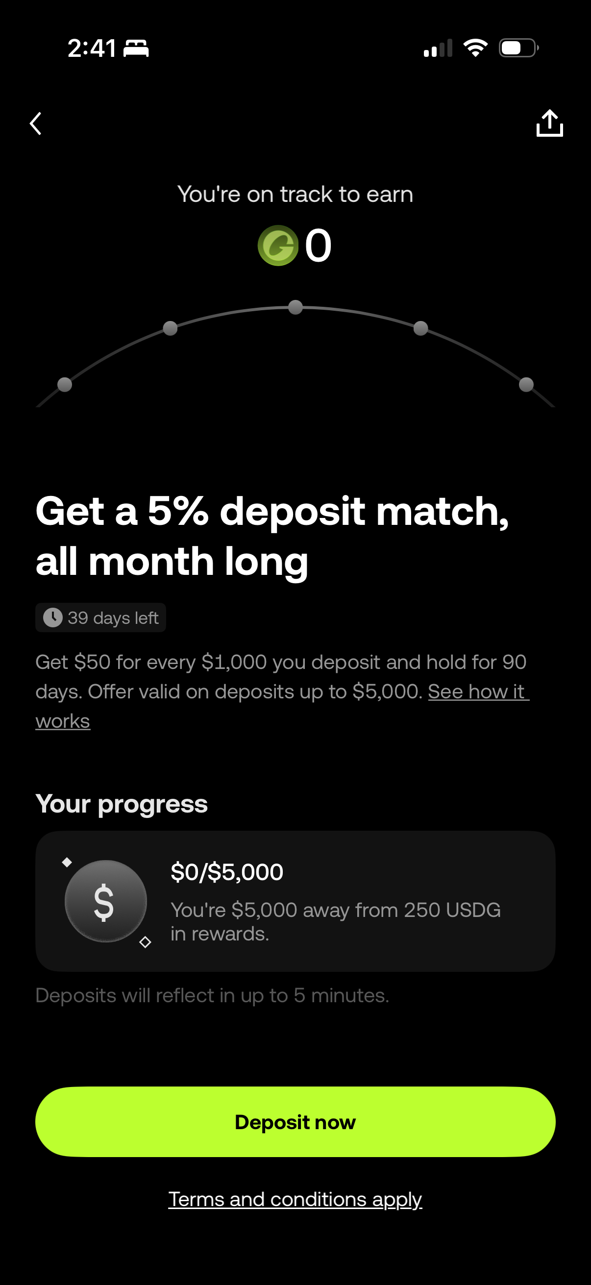 购买 200 美元的加密货币(推荐买 USDG:可 1:1 提现,且有 5% APY),可以获得 200 奖励