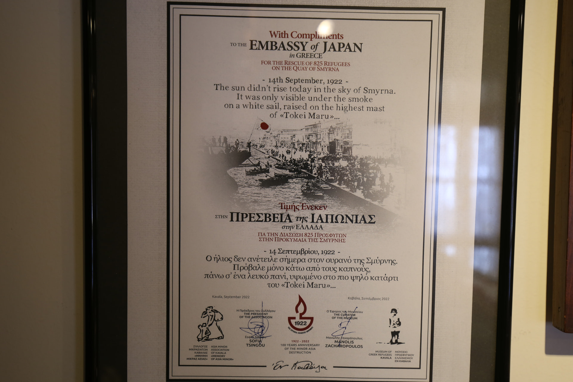 这里专门纪念1922年士麦那大火期间,一位日本船长挽救多名希腊难民