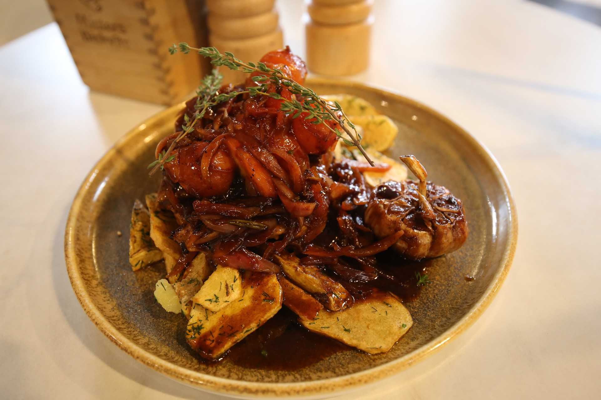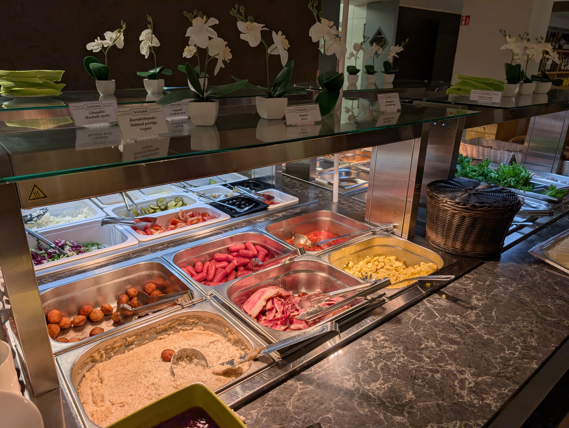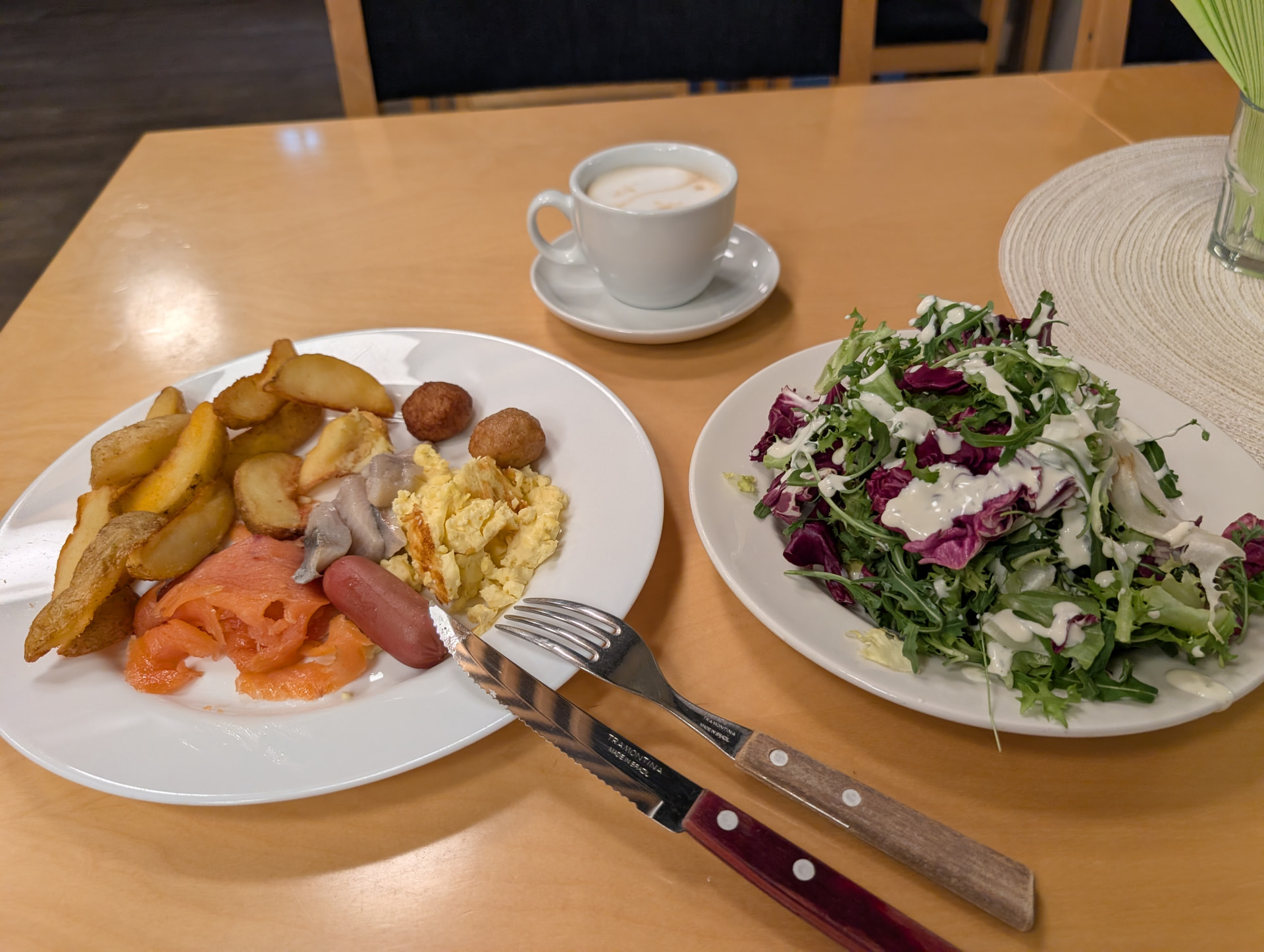 到了 Sigulda 之后,去火车站旁边的 cafeteria 吃了晚餐 (Bazārs)。我点的是正餐 - 猪扒 + 土豆 + 洋葱 + 蒜头。第一次见蒜头是这样带皮弄熟的