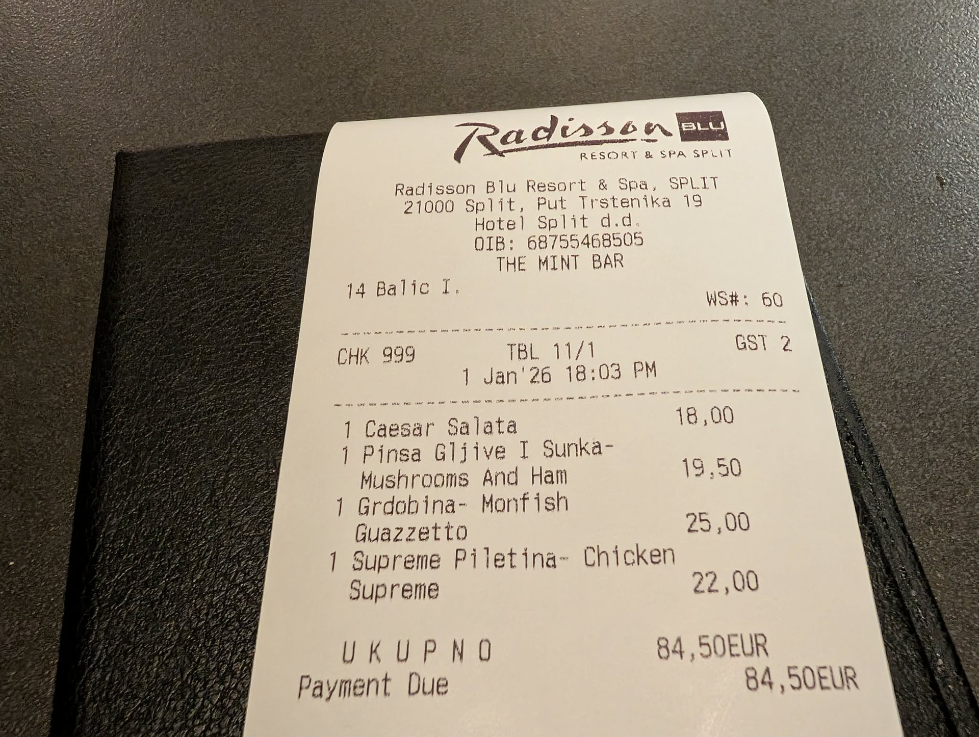 四道菜总价84.5欧,折合美元刚好 $99.14,最大化使用了 $100 credit
