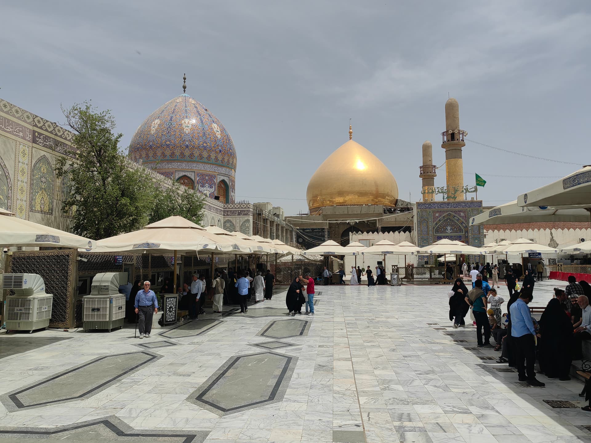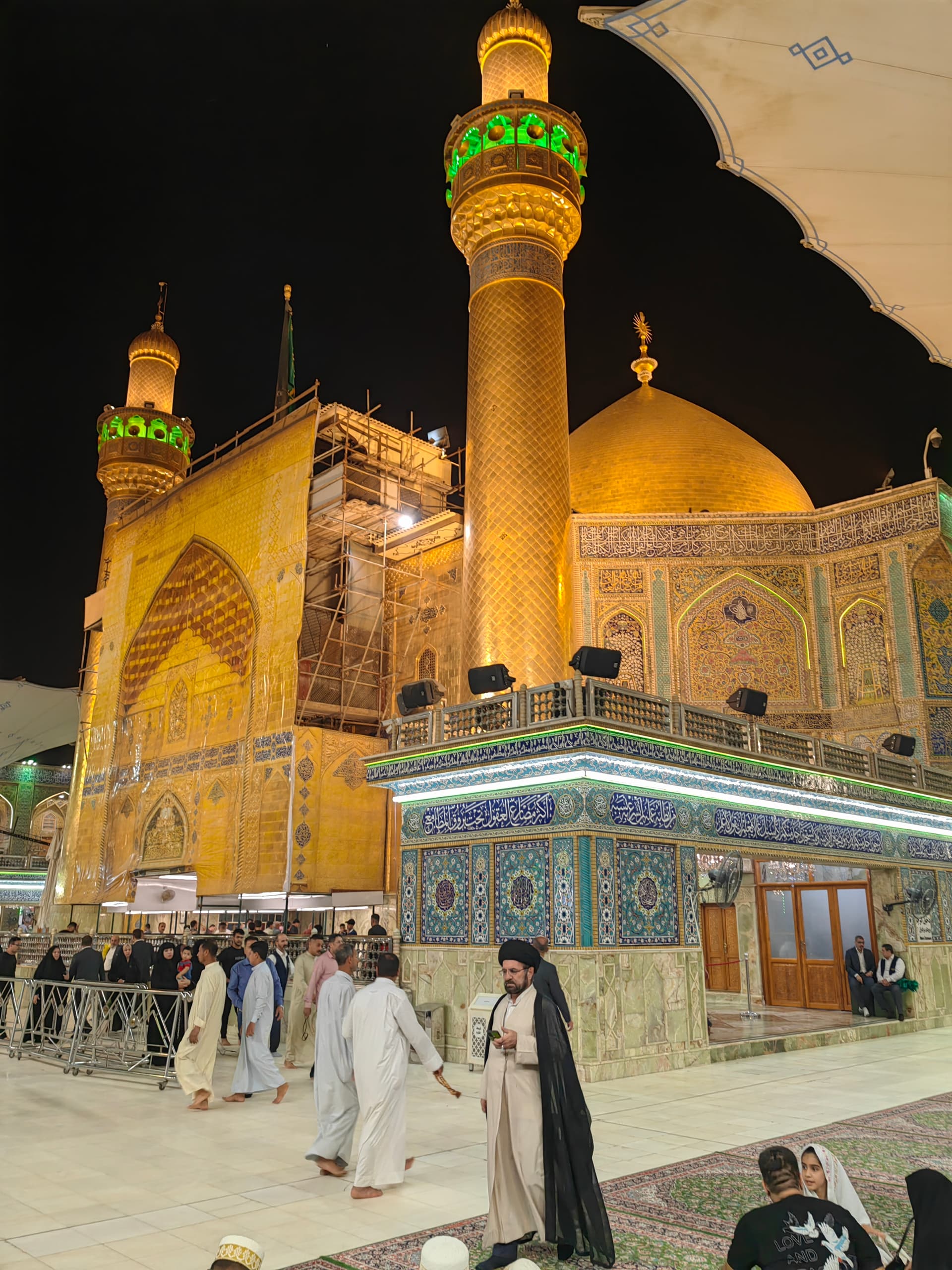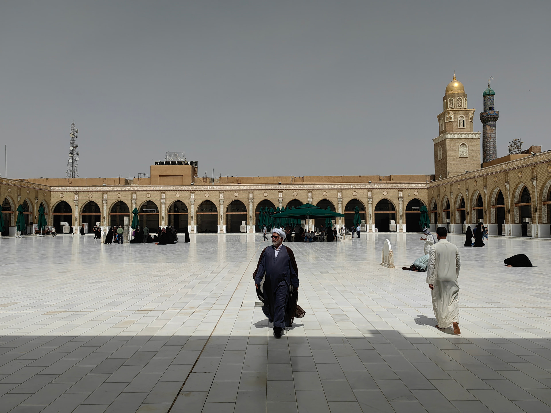 中巴北上250km到圣城纳杰夫。跟旁边小哥一路攀谈,临下车他竟然把我车费付了。除了麦加麦地那两派都认,纳杰夫算是什叶派第一圣城。城里常见伊朗人,霍梅尼流亡的14年里主要在纳杰夫。中巴小哥说这里有世界最大的朝圣,期间他家会开门纳客接待朝圣者。心想不是麦加吗?他家是不是富豪?后来一查所言不虚,自搜Arba’in pilgrimage,数百万朝圣者 (annually 两千万) 从纳杰夫步行80km到卡尔巴拉,当地人会慷慨提供免费食宿。主要朝圣点 Imam Ali Holy Shrine 葬有穆罕默德的堂弟/女婿/什叶派创始人第一任伊玛目阿里。