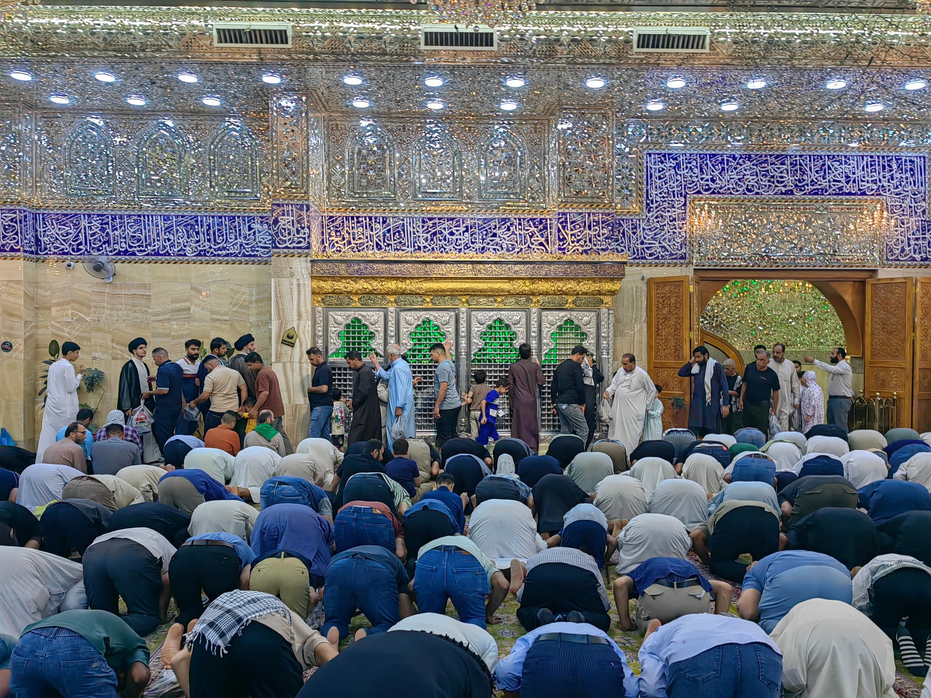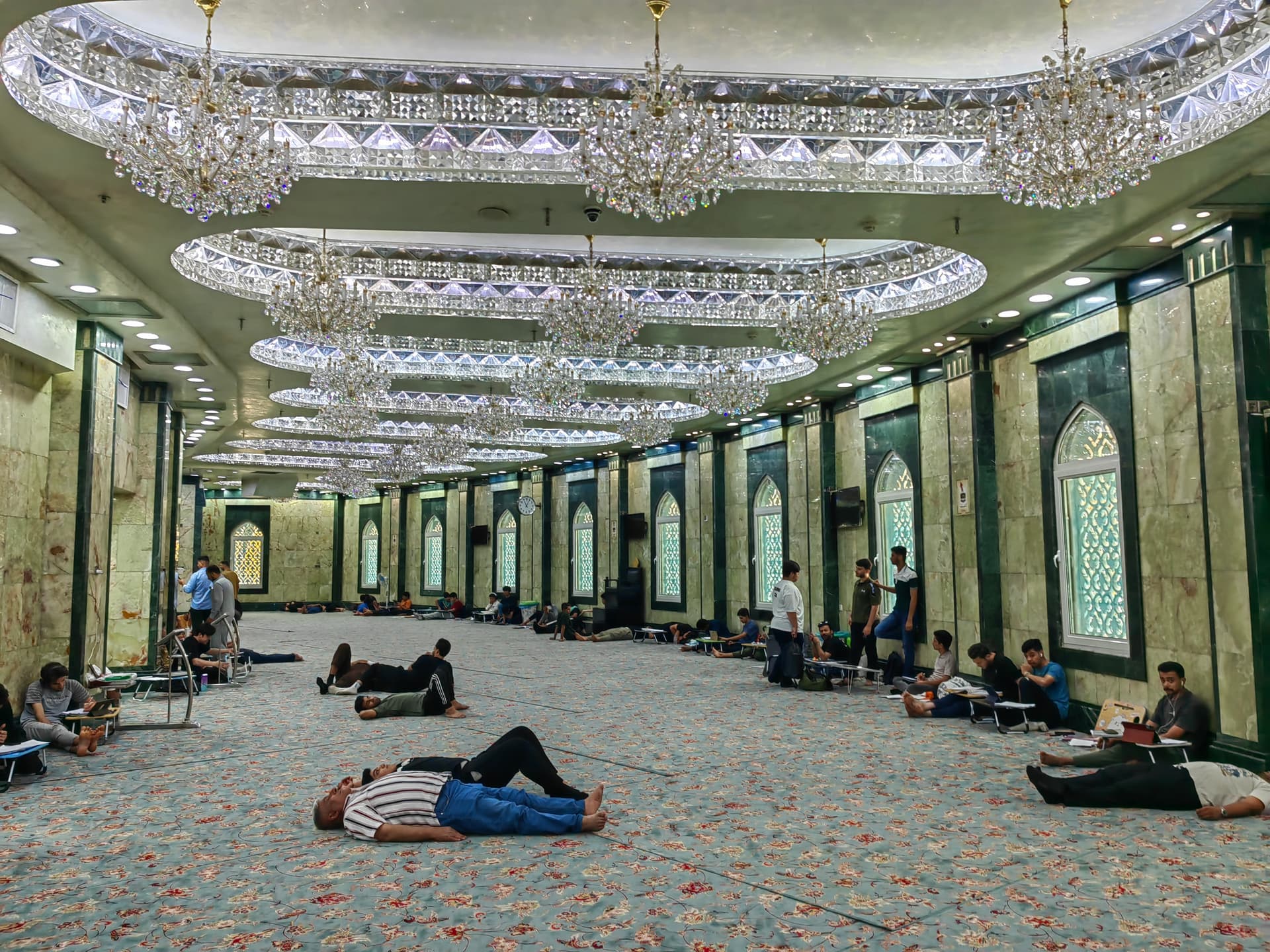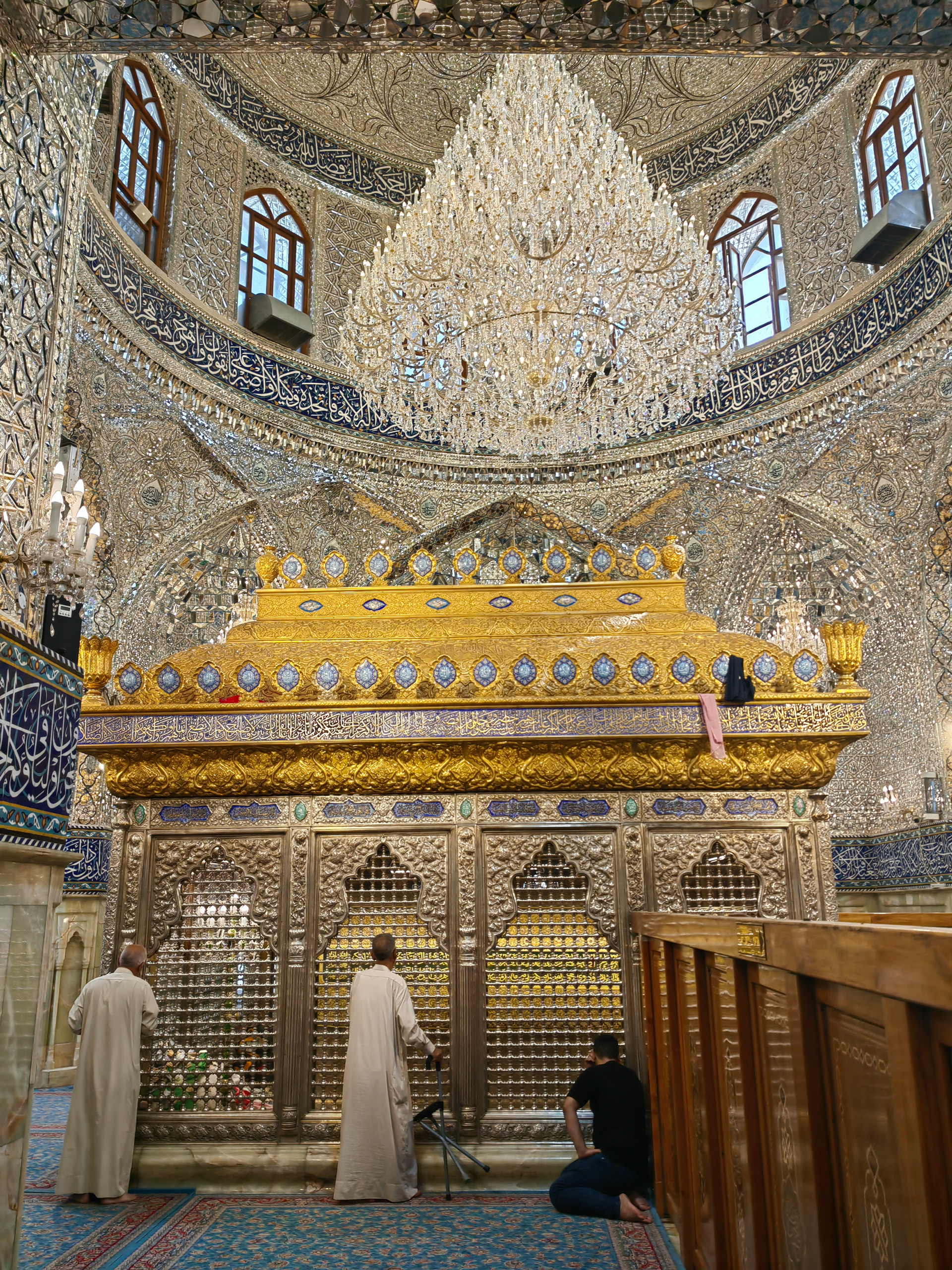 中巴北上250km到圣城纳杰夫。跟旁边小哥一路攀谈,临下车他竟然把我车费付了。除了麦加麦地那两派都认,纳杰夫算是什叶派第一圣城。城里常见伊朗人,霍梅尼流亡的14年里主要在纳杰夫。中巴小哥说这里有世界最大的朝圣,期间他家会开门纳客接待朝圣者。心想不是麦加吗?他家是不是富豪?后来一查所言不虚,自搜Arba’in pilgrimage,数百万朝圣者 (annually 两千万) 从纳杰夫步行80km到卡尔巴拉,当地人会慷慨提供免费食宿。主要朝圣点 Imam Ali Holy Shrine 葬有穆罕默德的堂弟/女婿/什叶派创始人第一任伊玛目阿里。