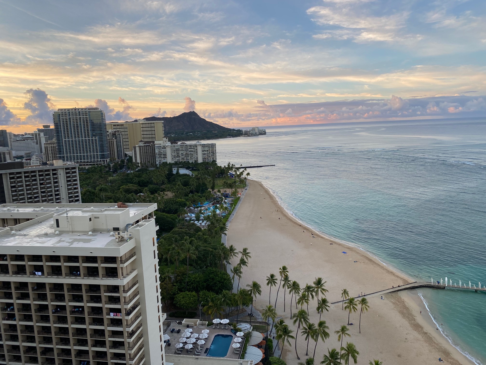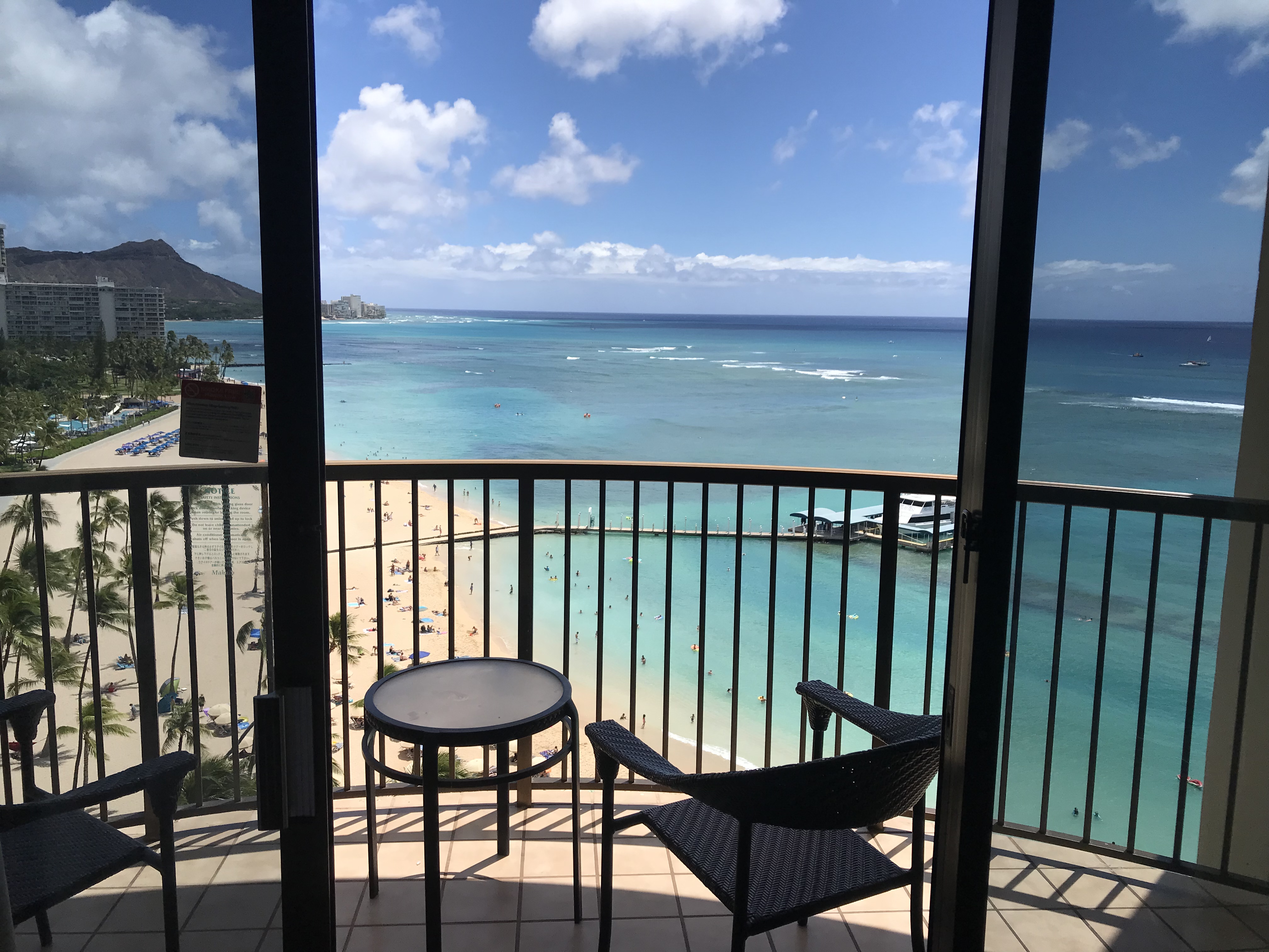 第一晚住的Tapa Tower,装修很老而且所谓的海景房很差,被很多楼挡着。之后的五个晚上和前台谈心换到了Rainbow Tower的海景房,装修谈不上豪华新颖但是远胜Tapa Tower,感觉是美国本土大城市四星酒店的标准。LZ的海景房可以看到整个Wakiki Beach和钻头山,可说是十分满足了。