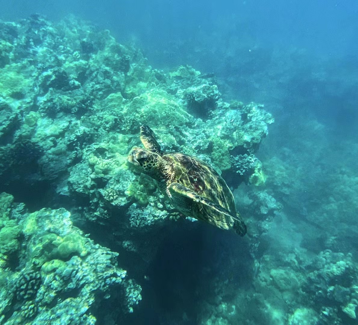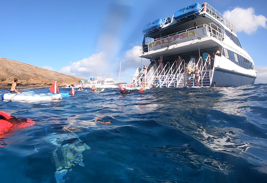 游玩:茂宜岛的浮潜是世界级的!我们报的船去月亮湾和海龟镇,从早上七点半玩到12点半,包早餐和午餐。我和LD没吃午餐不过早餐还是不错的,有巧克力Muffins和一些水果。个人推荐Calypso的船,到了月亮湾才发现我们家船是最大最稳的,还有宽敞的室内可以避风。其他的船比较小,很多人都在甲板上待着。从码头到月亮湾要开45分钟所以推荐大船,不然还没有到月亮湾就先被海风吹得不行了。