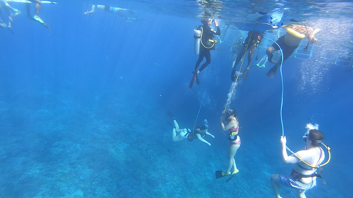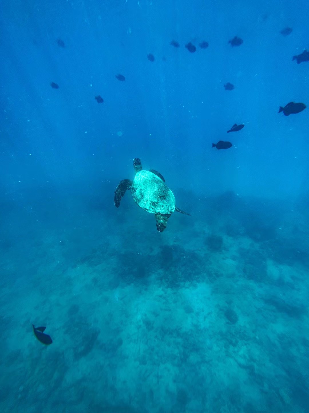 无论是月亮湾还是海龟镇,水都超级清超级蓝。月亮湾比较深,大概10-30米,大多数鱼都在海底珊瑚湾里穿梭。LZ会自由潜所以就下去拍了很多视频,不会自由潜的推荐玩Calypso提供的Snuba(需要预约),氧气瓶在水上充气艇里,人插着管子一直在水下待着,不需要任何潜水证。而且Snuba还有一个背氧气瓶潜水的向导带你找鱼。如果全程浮在水面上的话很难和鱼儿有近距离的接触。海龟镇就比较浅,不到10米,而且海龟超级多!我们一行人看到了大概5-10只海龟,而且有几只海龟还浮到水面换气,离我们只有不到一米的距离,可以说是一生难忘的经历了。