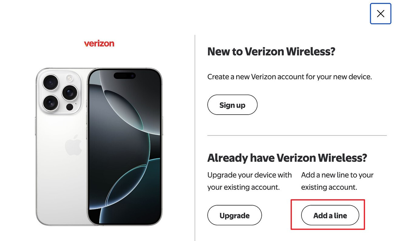 因为我已经是 Verizon 老用户,所以直接选 Add a line(新开一条线)