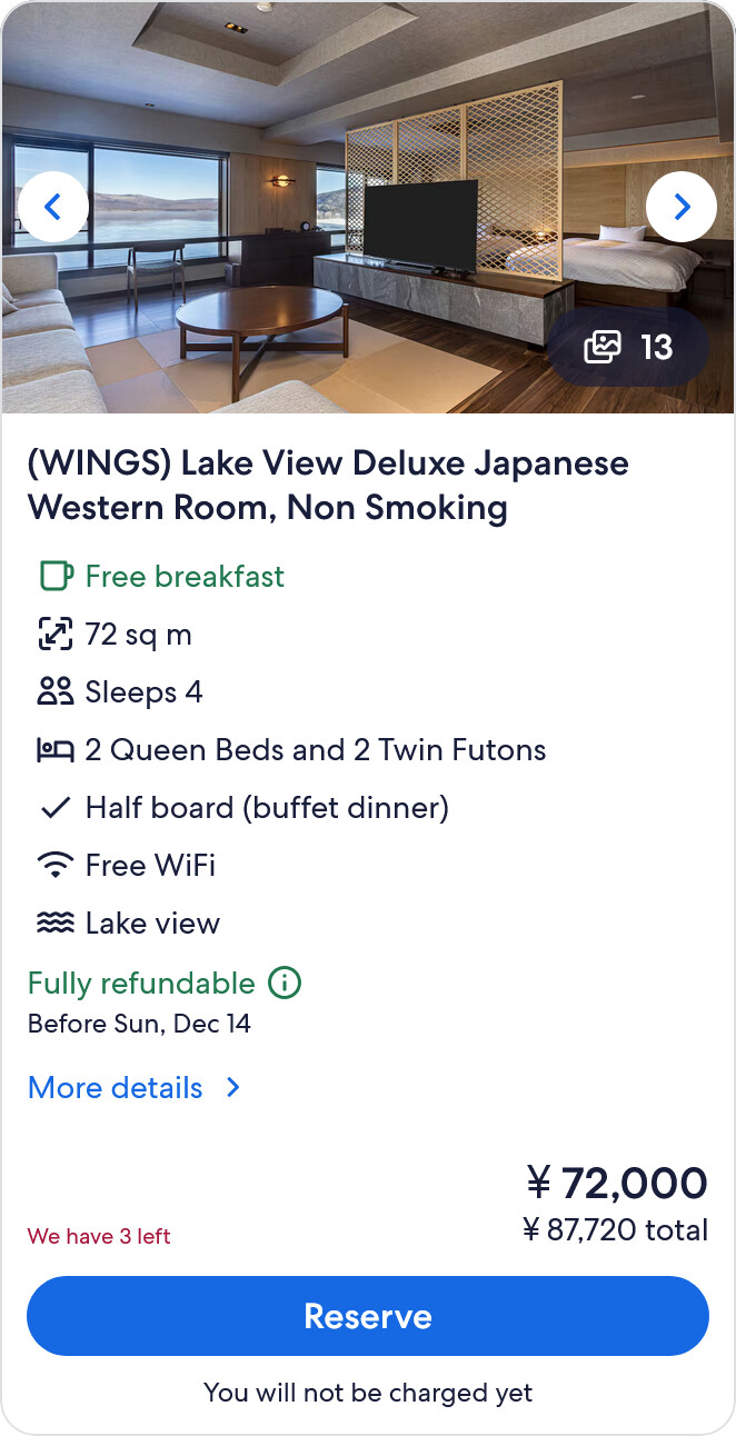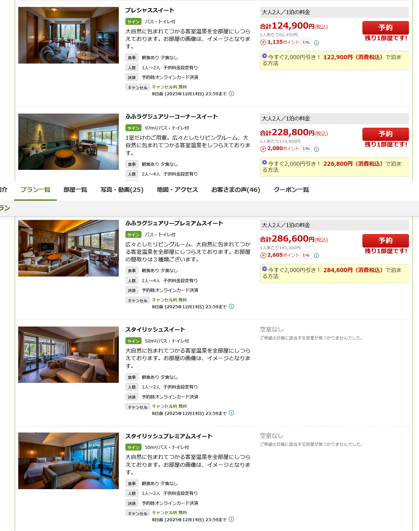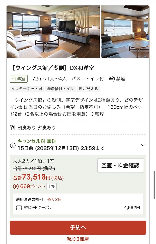 举个例子,隔壁贴刚好提到 あかん遊久の里鶴雅这家酒店,如果12月28日入住,同样的配置(早晚餐自助,同房型WINGS Lake View Deluxe Japanese Western Room)