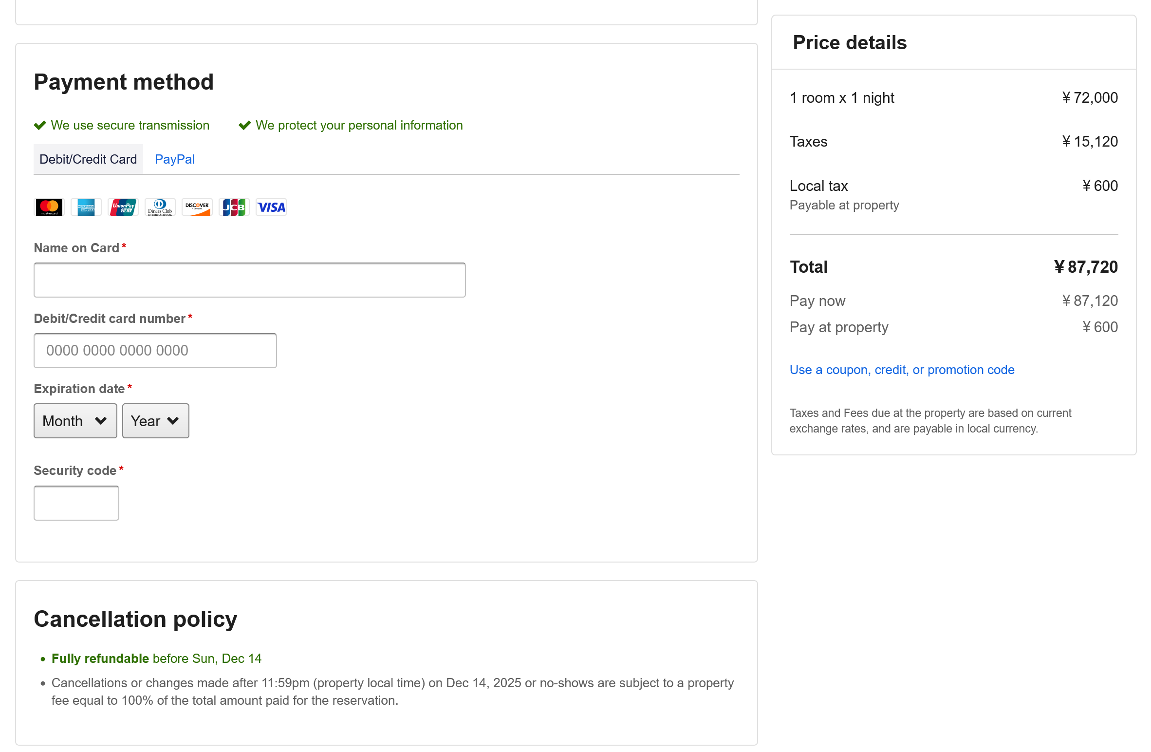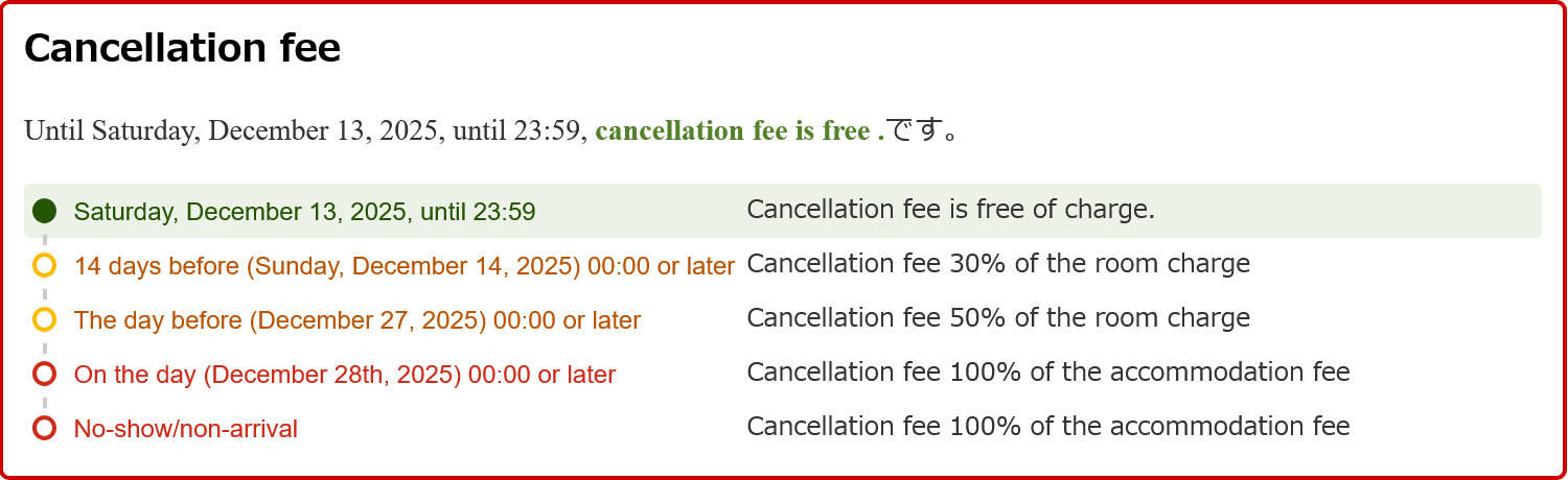 乐天:只需提供信用卡信息,可以到酒店付款。取消政策:14天~2天前:扣款30%,2天~1天前:50%,当天取消:扣全款。