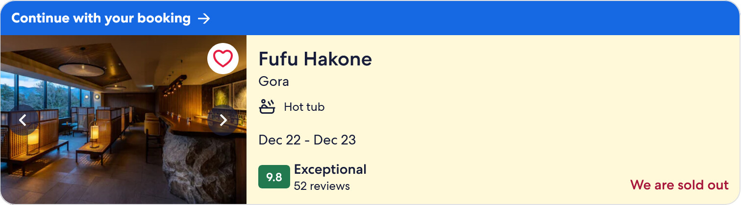 举个例子,泥潭人气酒店箱根fufu在12月22到12月23的availability