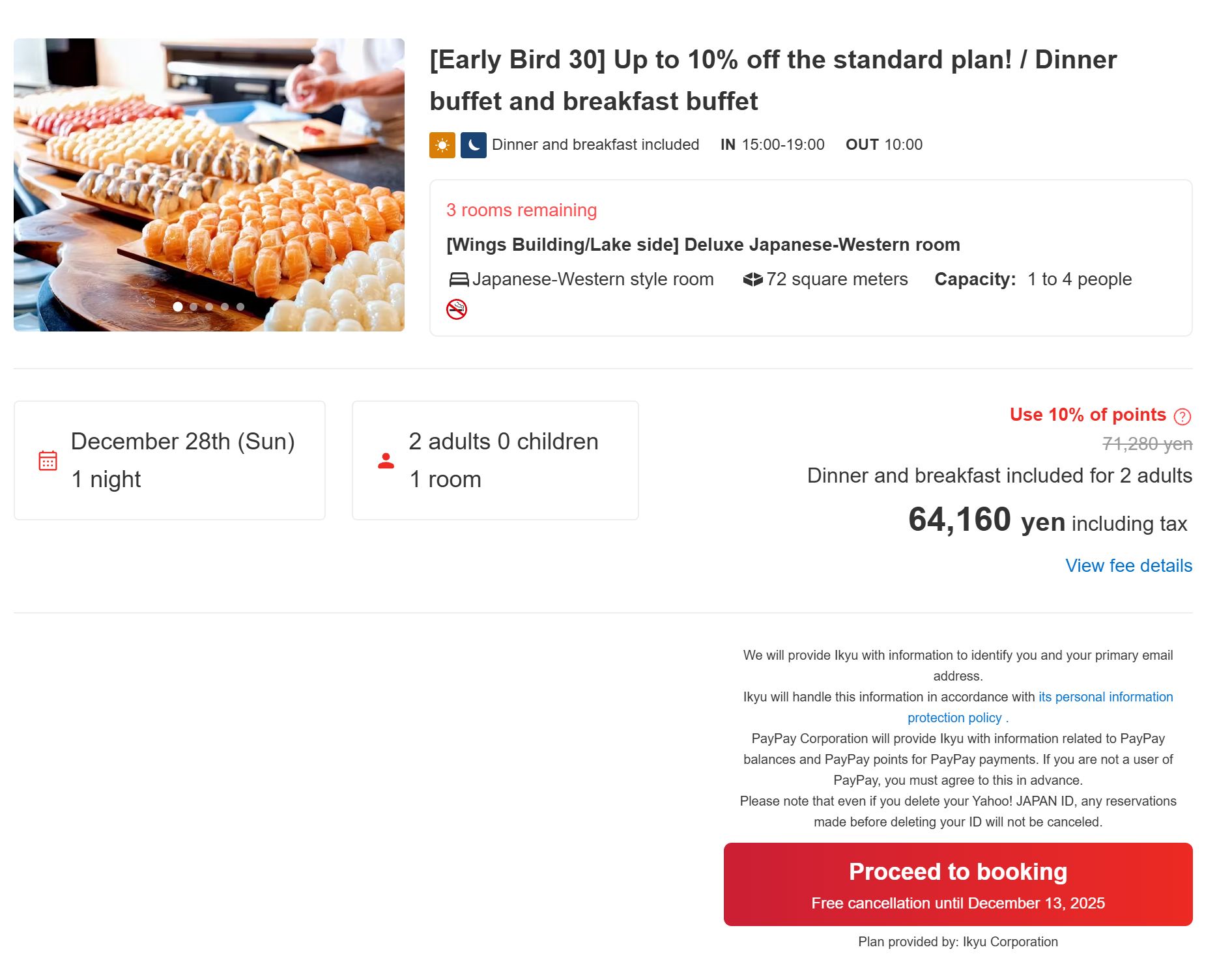 立省23560円,相当于73折。(yahoo这个有10%是按paypay点数的方式返现的,但是按楼下DP可以在这次预定当场用掉)