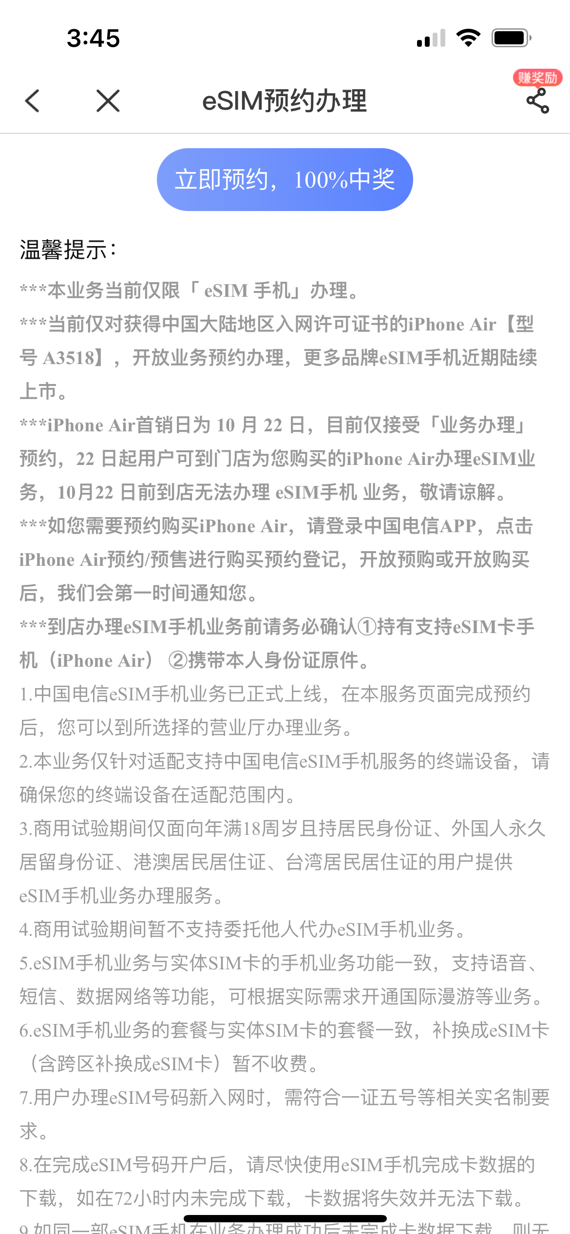 需要预约去营业厅办理,中国电信目前仅限A3518 iPhone Air