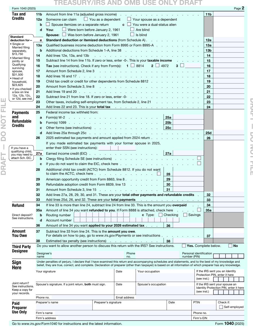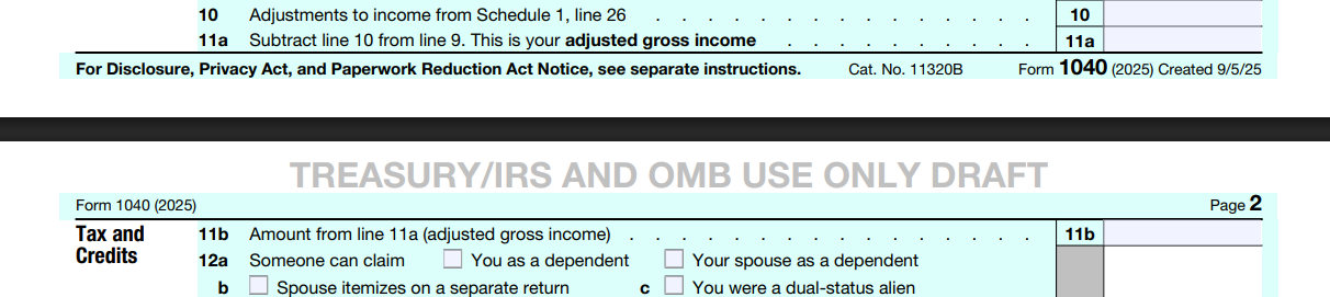 由于 1040 被重新设计了,你的调整后收入AGI 现在会出现在两个地方:它是第一页的最后一行 11a,同时也是第二页的第一行 11b。