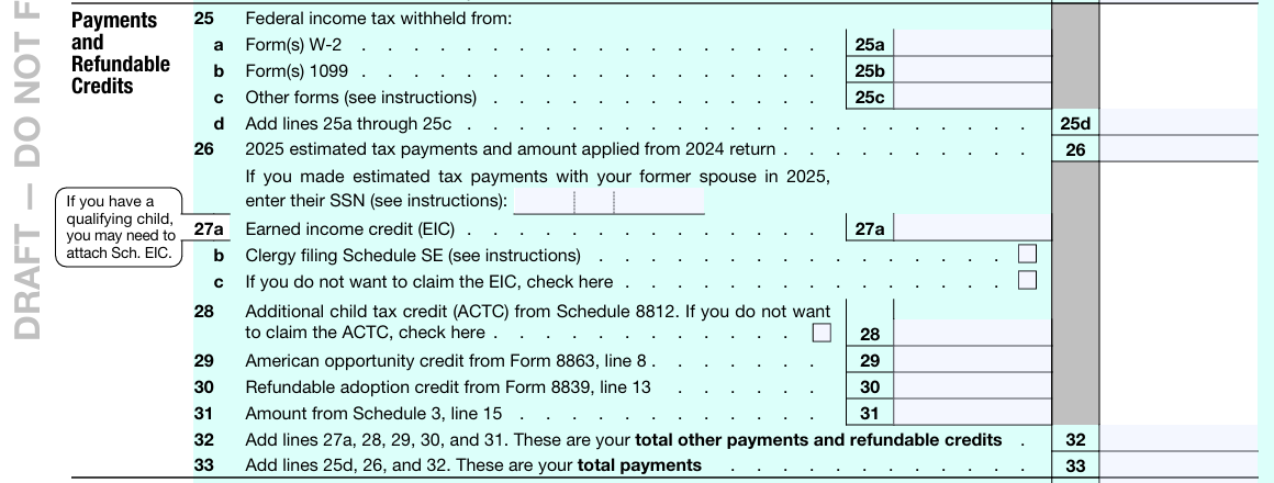 Payment 和 Refundable Credits 这块也有些变化,如果你在婚期间缴过预估税,但现在你是以未婚身份申报,那么在 26 行上必须填上你前配偶的SSN。其次,针对EITC和ACTC 这两条新加了打勾的选项,允许纳税人选择不申报这些抵免额。最后,30 行以前是写着reserved for future use,现在它被启用了,专门用来申报Adoption Credit中可退还的那部分金额。
