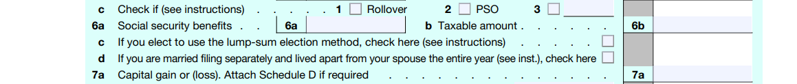 在申报Social Security收入这块,税表上新增了一条 6d 行,它是一个打勾的选项。这个选项是专门给那些夫妻分开报税(filing separately),并且一整年都跟配偶分居的纳税人准备的。如果你符合,就必须在 6d 行这里打勾。