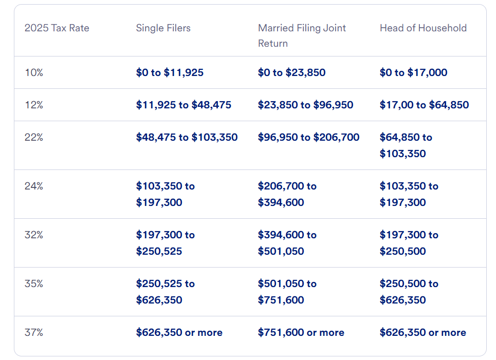 虽然大家一直在热烈讨论未来税率会不会变动,但是 OBBBA 这项法案已经把《减税与就业法案》(2017 TCJA)确定的那七档个人所得税税率永久地固定下来了。具体到 2025 年,最高的 37% 税率,不同报税身份档位不一样:MFJ和Widow的应税收入超过 751,600 美元就开始交 37%;MFS是 375,800 美元;单身和HOH都是 626,350 美元;而对于遗产和信托来说,应税收入只要超过 15,650 美元,就得适用 37% 的最高税率了。