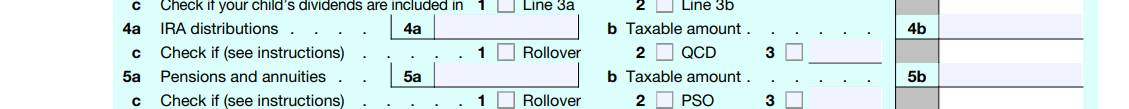 当你从 IRA 账户里取钱,税表上现在新增了两个打勾的框,让你必须标明:这笔钱是不是因为它属于Rollover 或者 “(Qualified Charitable Distribution, QCD),”所以不用被算进你的应税收入里。同样地,在申报你收到的养老金或者年金收入时,也新加了打勾选项,让你去标明这笔钱是不是属于Rollover,或者是不是根据Pension Sharing Order 分配给你的。