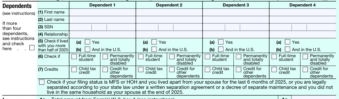 这次税改对申报受养人的部分做了彻底的重新设计,跟以前不一样了,现在新加了几个打勾的选项,让你必须更具体地报告情况:比如你得勾选确认这个受养人是不是跟你住在一起超过了半年以上,并且要说明他们的特殊身份,比如他们是不是全职学生,或者是不是永久性地完全残疾,目的就是让IRS能够更清楚地判断你是否有资格获得相关的税收抵免。