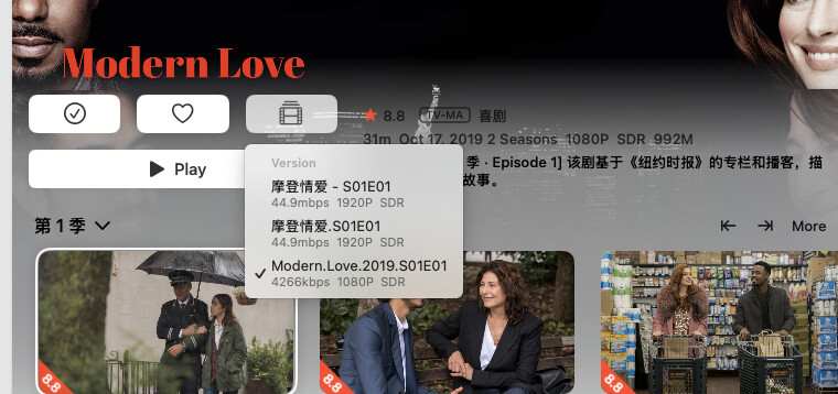 好像一个资源只有一份文件吧,没法选4k还是HD,这种服务也不可能提供云端转码。看了有个剧码率有47.1mbps,我感觉也不是我的网的问题,而是他的服务器就没法持续提供这么高的带宽,不知道这个剧要怎么看?Modern Love (2019)