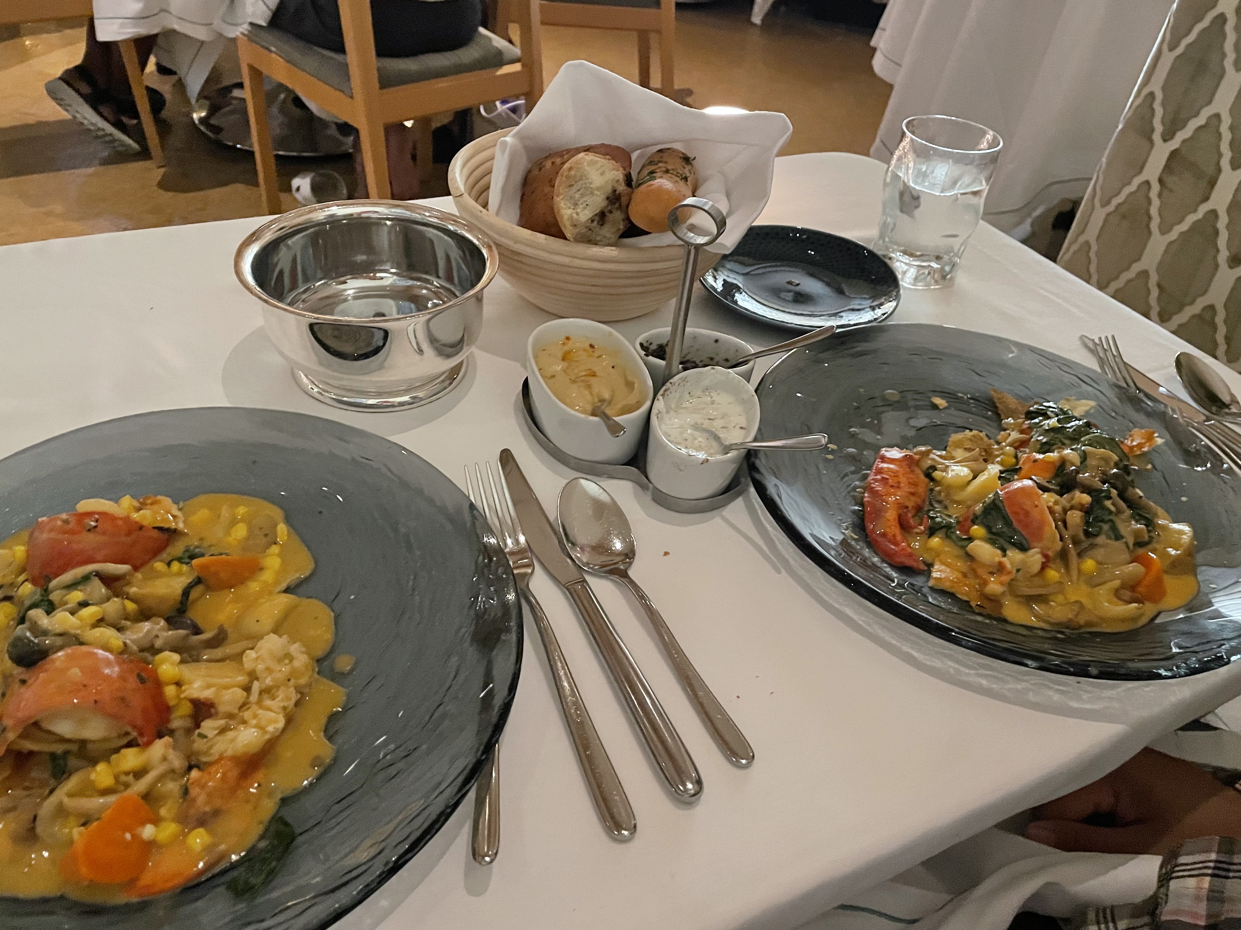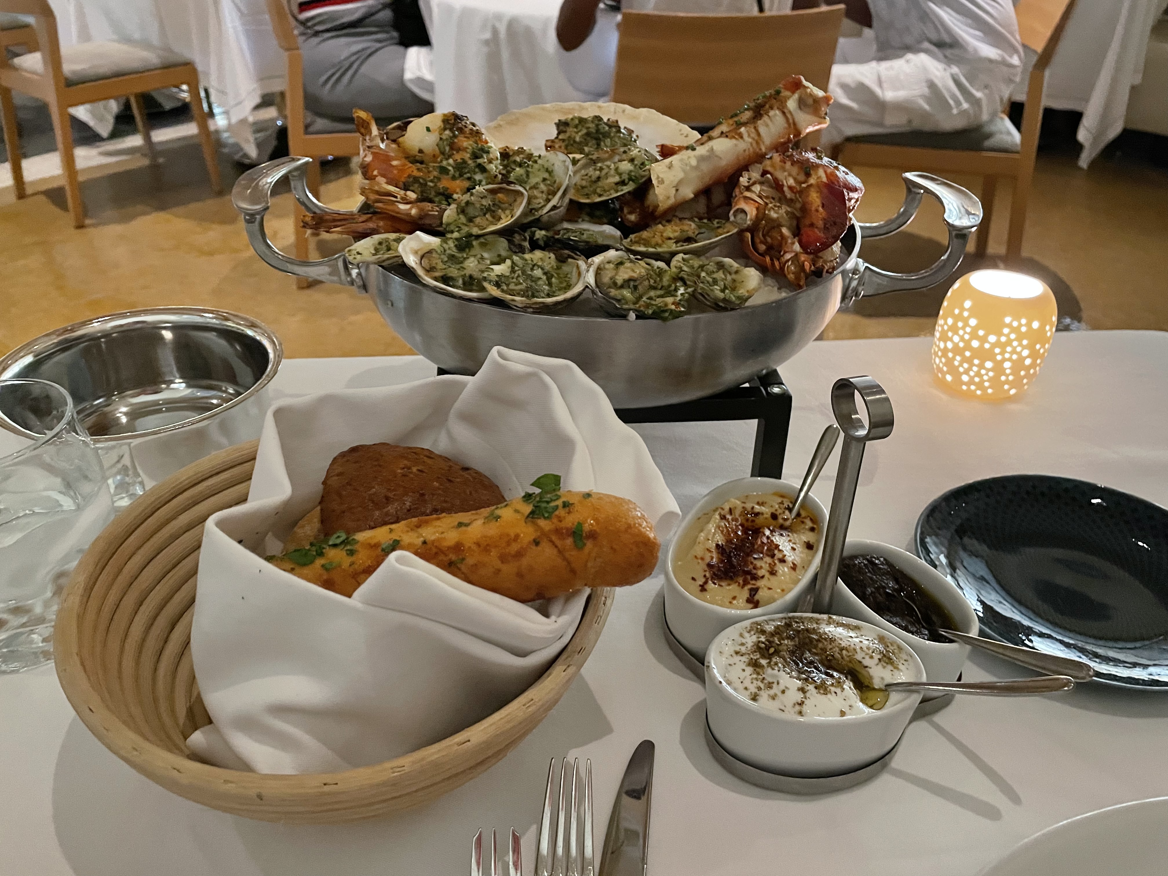 这次室友点了两道菜,hot charcoal-grilled shellfish platter (petite) 和网上推荐的lobster pot pie。酒店另送了bread basket。之后又点了chocolate cake and sorbet做dessert。