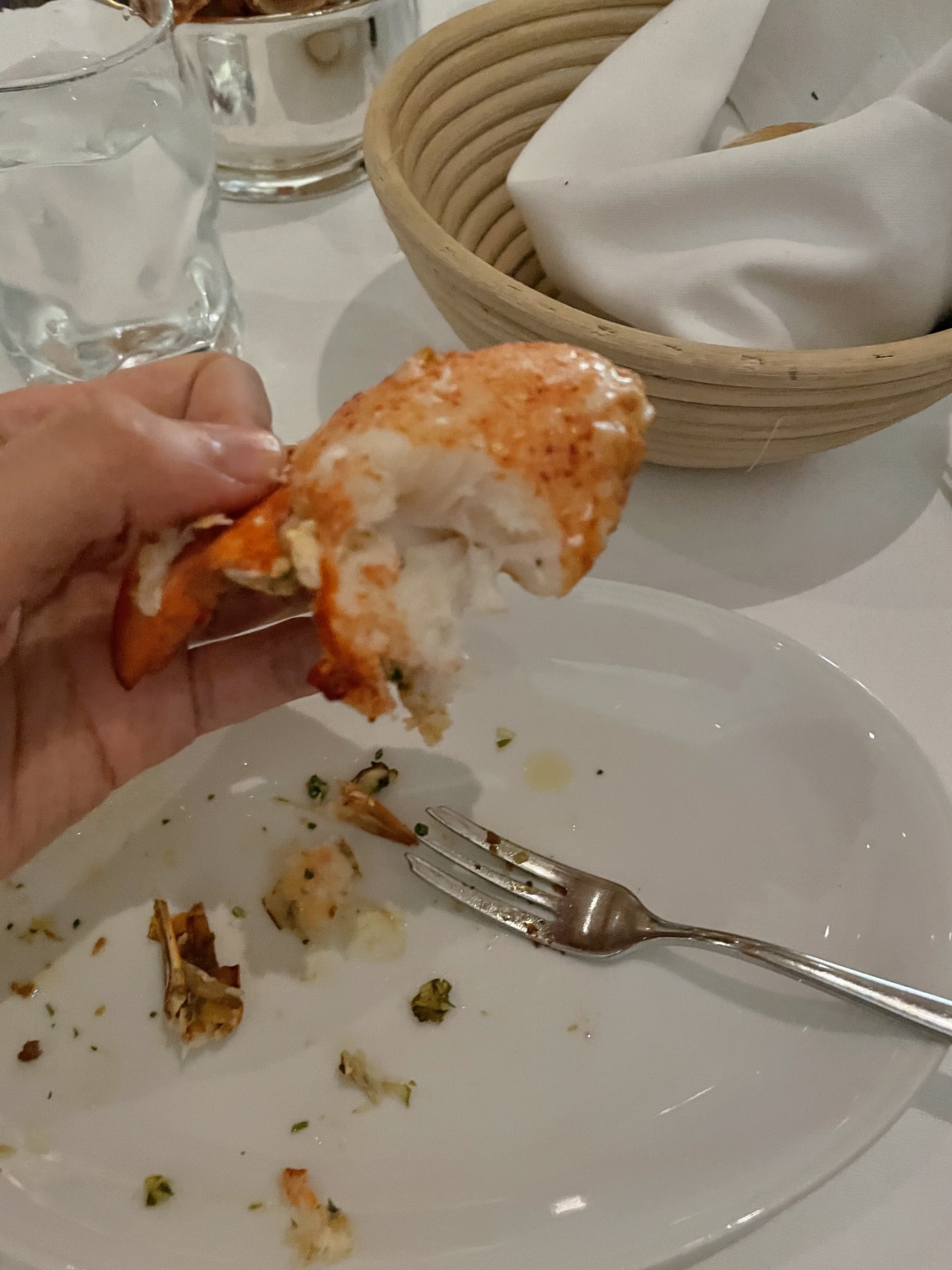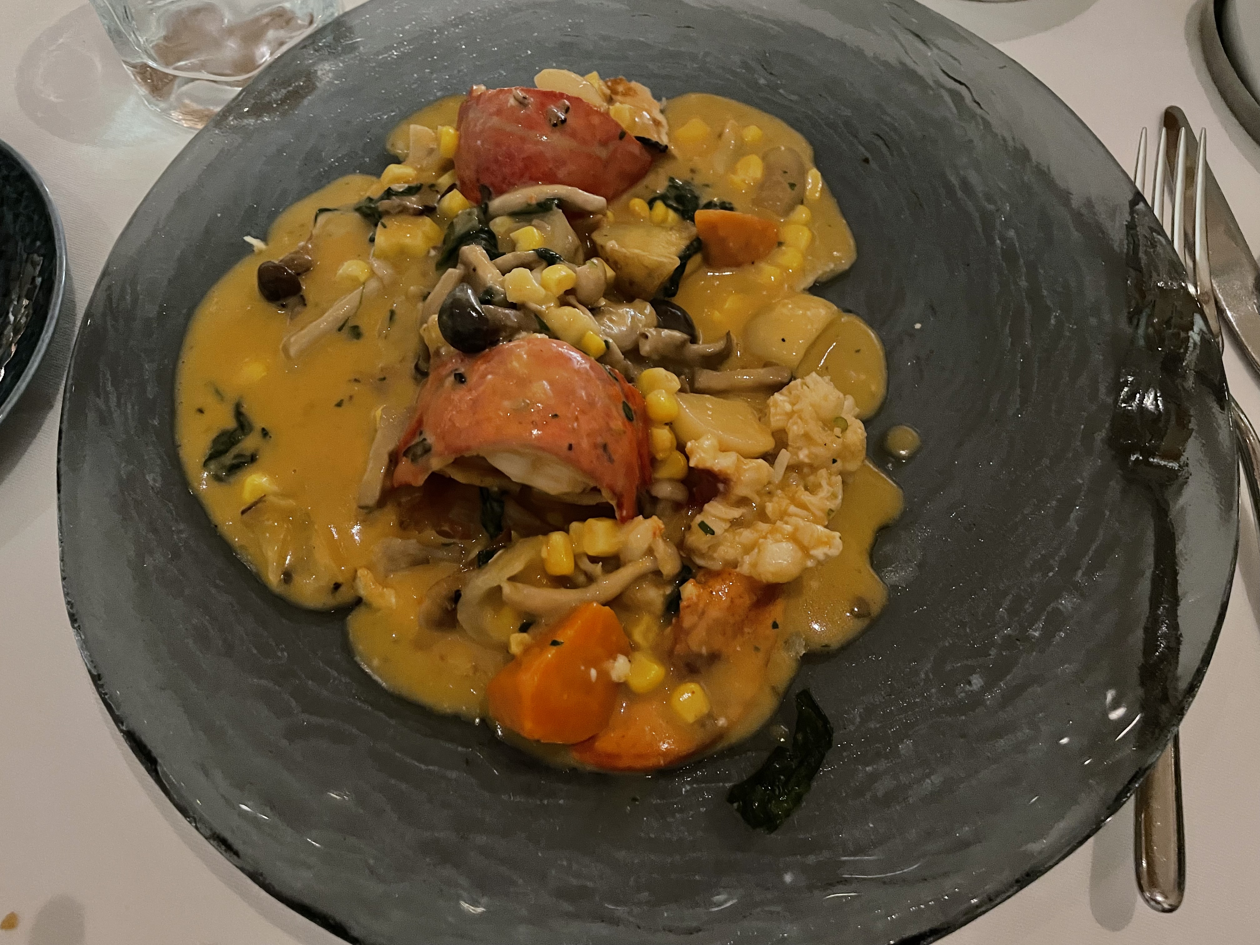 接下来是网上大受好评的lobster pot pie。服务员端上一只大锅,切开饼皮,和里面的内容一起分成两份,我和室友一人一半。室友认为lobster的香味充分得混在了pie的汤汁里,用面包蘸着还不错,有点过咸导致鲜味不突出。我还是觉得safeway 10几块钱一只的买来蒸着吃最好,海味十足。