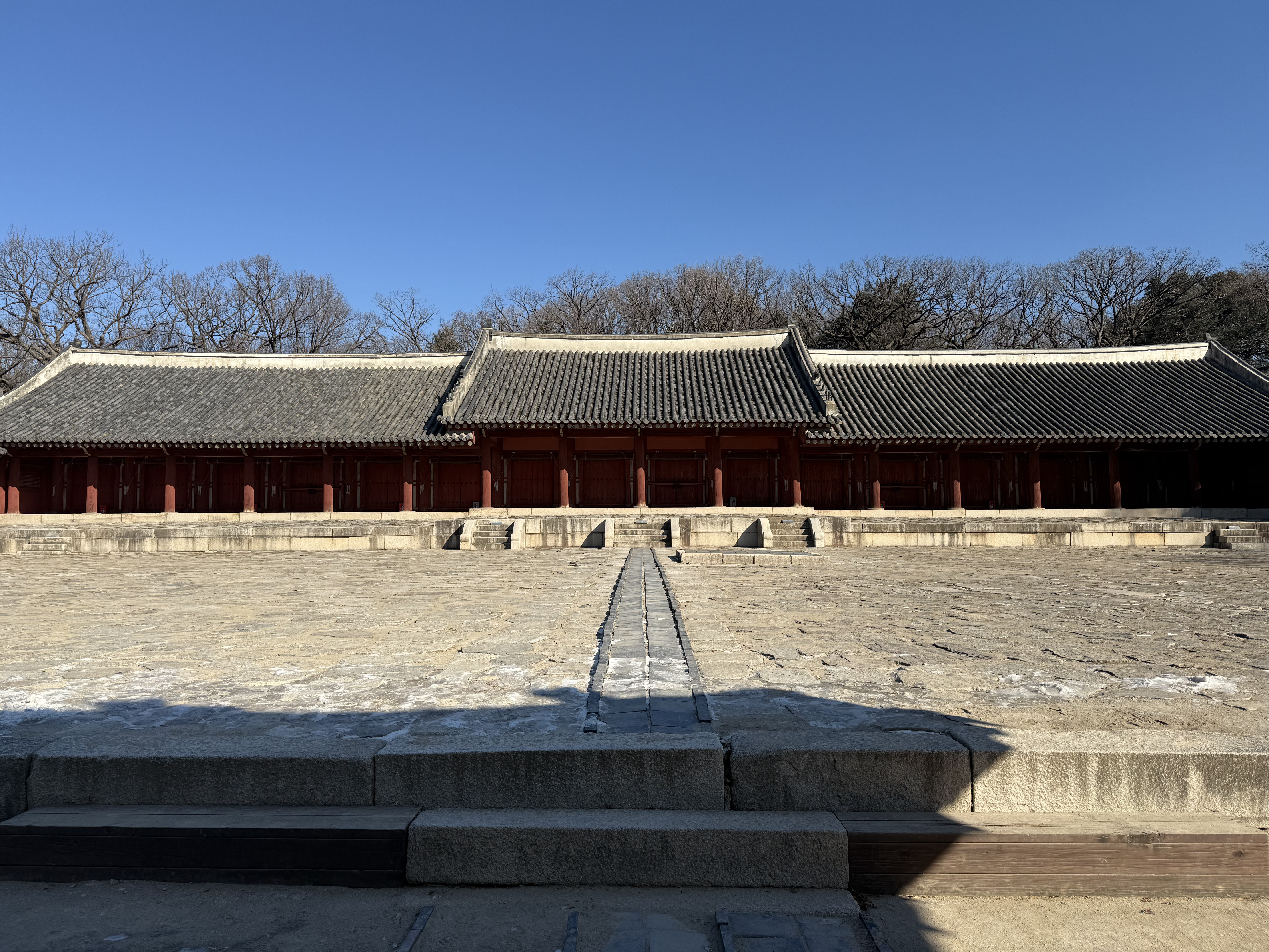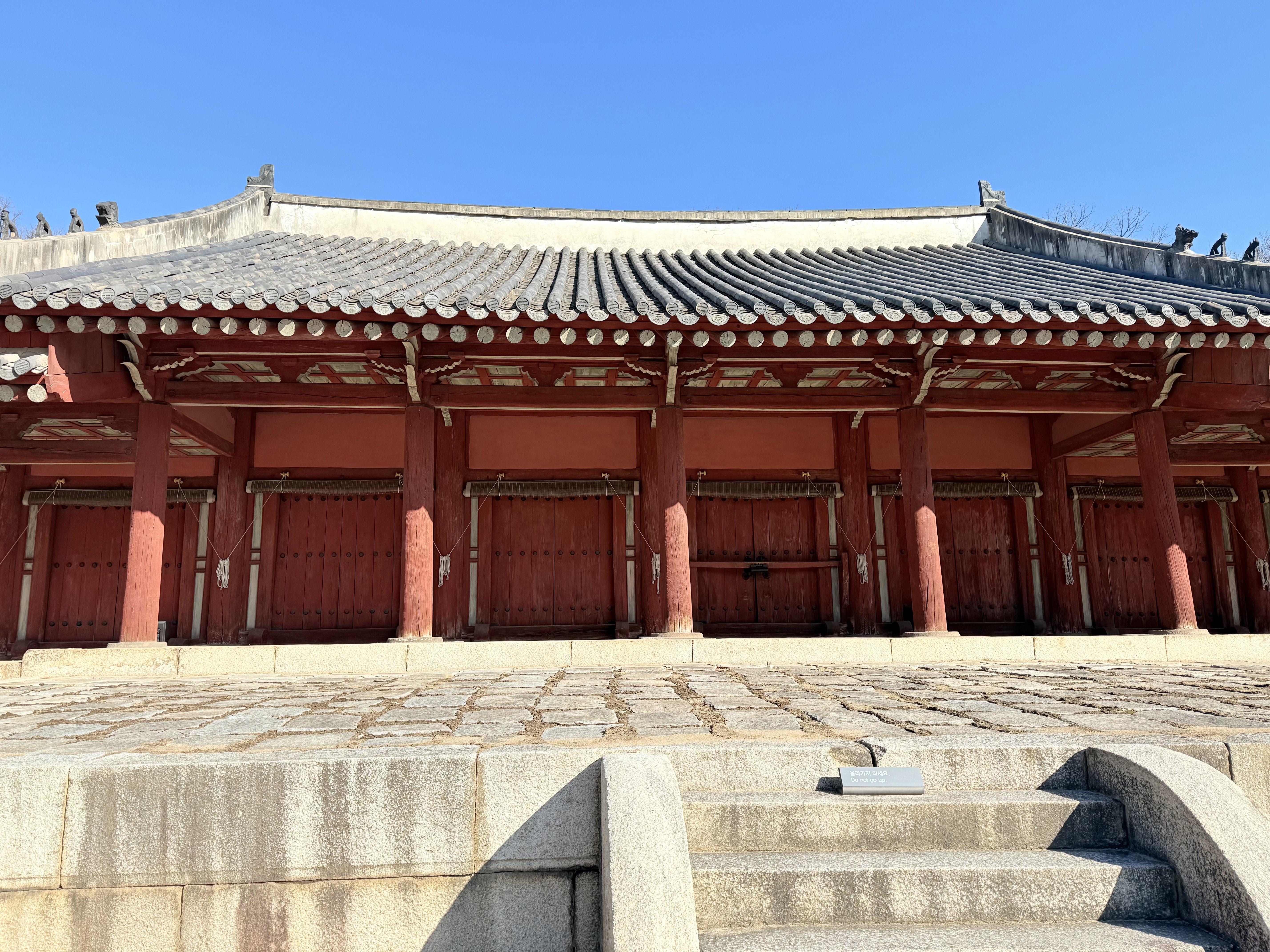 首尔宗庙(韩国):韩国的第一处世界遗产。说实话来到这里会让人疑惑为什么这里能成为韩国第一处世界遗产,也许和他们对朝鲜王朝的历代大王的情感有关吧。首尔宗庙是用来供奉祭祀朝鲜王朝的大王的祠堂,与太庙类似。我去的时候,恰好赶上中文讲解,门票含讲解只需要1000韩元,只有我一个中国游客,全程只有那位韩国的中文讲解员带领我逛首尔宗庙,至少从游客感受上来说,这个地方非常棒。此外值得关注的是,宗庙的永宁殿上存在着一种翼型拱,这种斗拱形制最早出现在佛光寺东大殿,但宗庙的修建年代实际上是17世纪以后了。