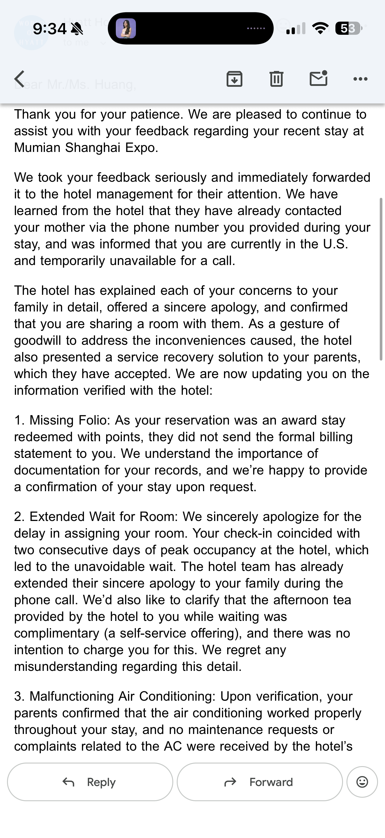后续就是po猪发邮件 给hyatt投诉 因为check in 留了个我妈的电话 酒店疯狂call了我妈 具体说啥我也不知道 我妈被人虔诚的打动了 然后今天收到这个邮件 字里行间吐槽无力 等楼主有空再上班摸鱼的时候再好好回复