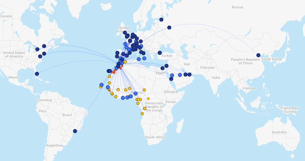 以下为皇家摩洛哥航空的航线图,来源Flight Connections。他家的大本营在卡萨布兰卡,唯一的亚洲航点是北京(大兴),其余航点覆盖欧洲、非洲、中东以及美洲东部。