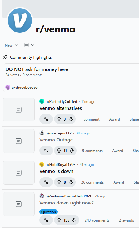 https://downdetector.com/status/venmo/ 我一般会查这个网站