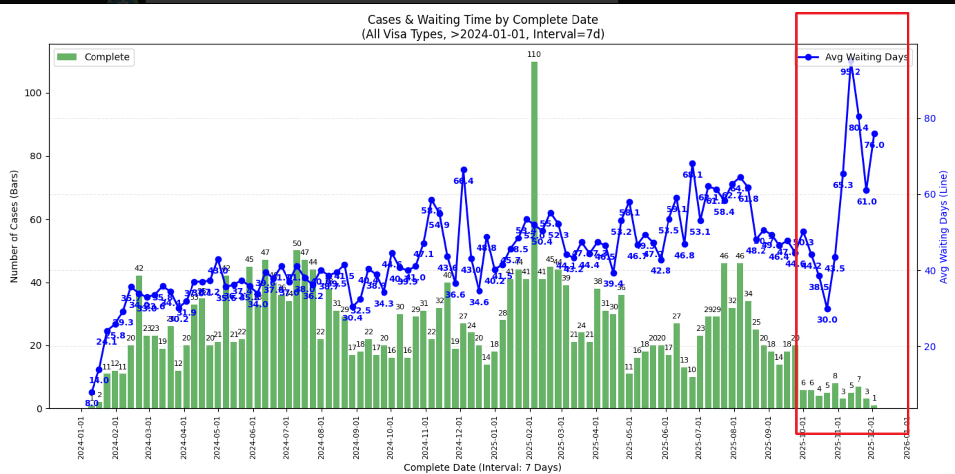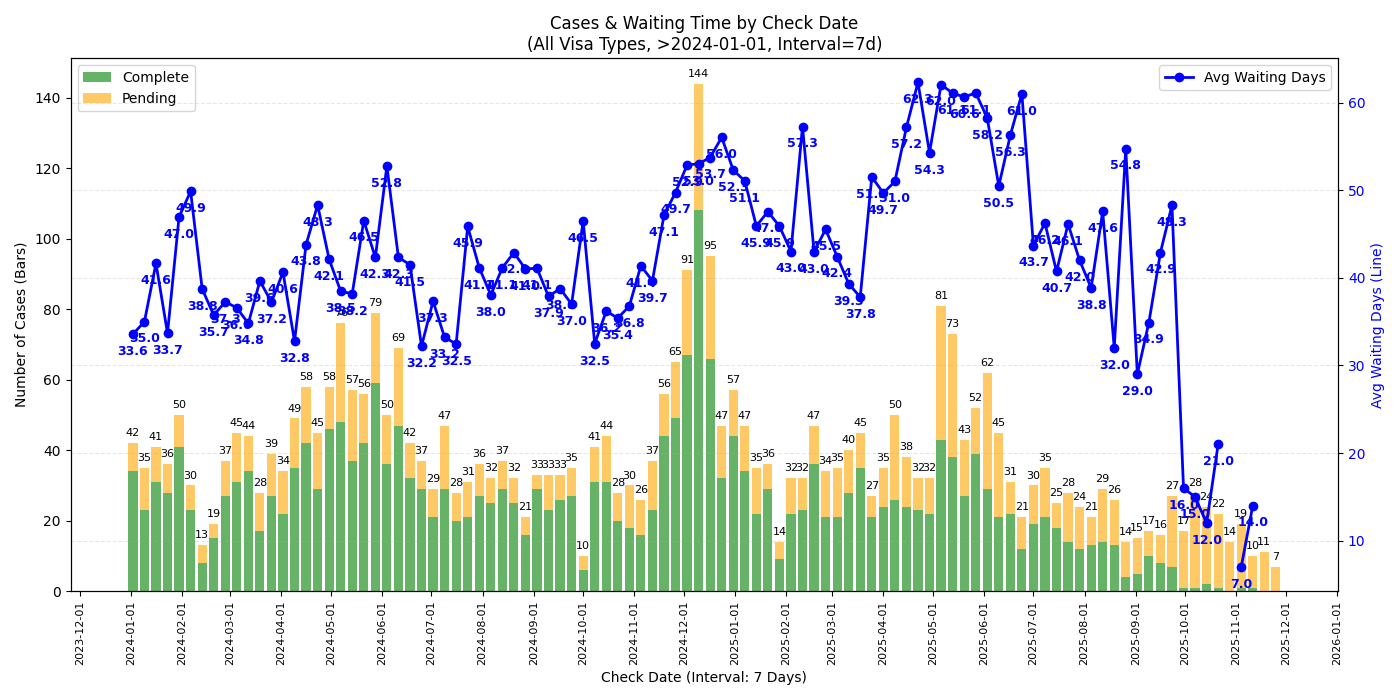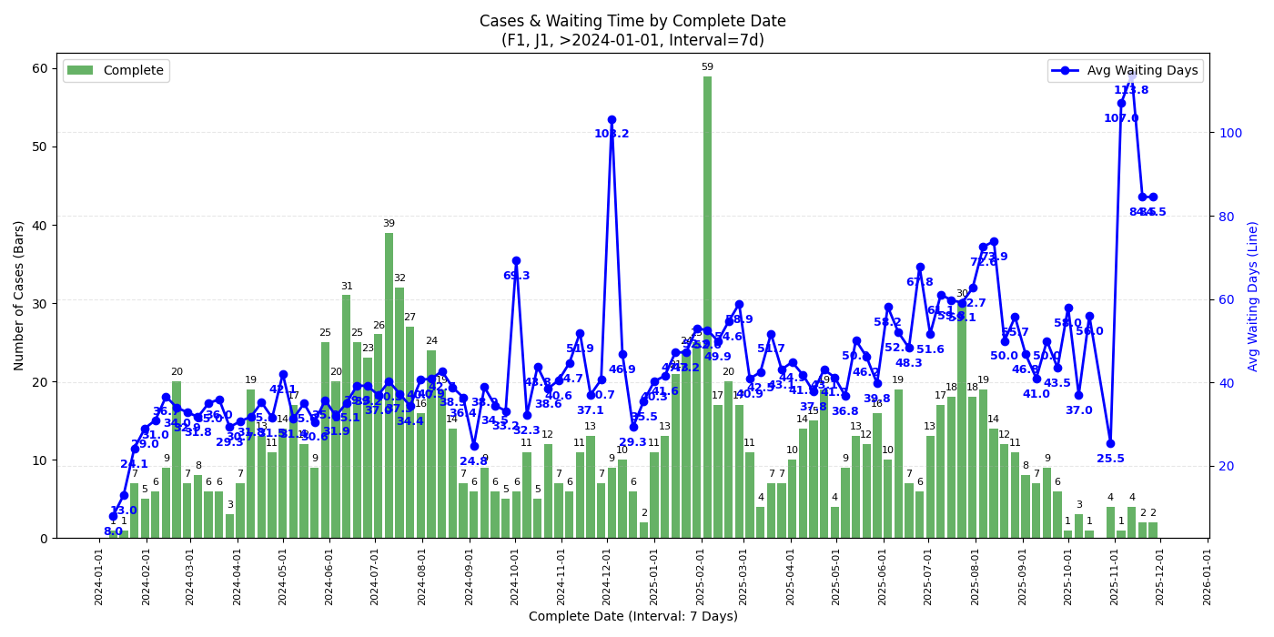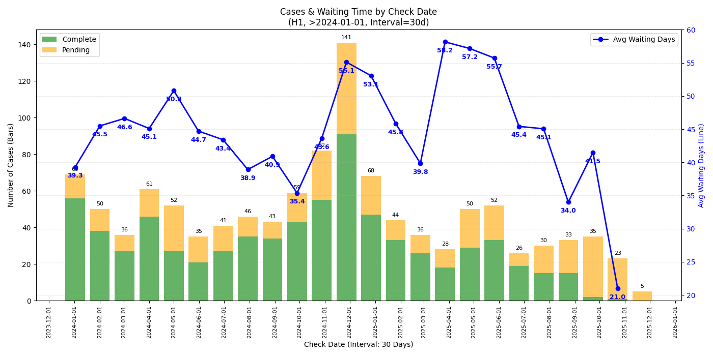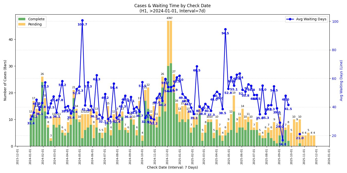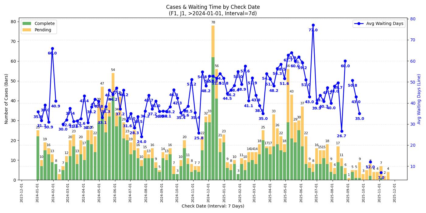 - 从 complete date 的图来看,最近 check 完成的 case (2025/11 中旬以后) check 时长确实有一个不小的上升,似乎有下降趋势但不知接下来的圣诞假期是否会再度上涨