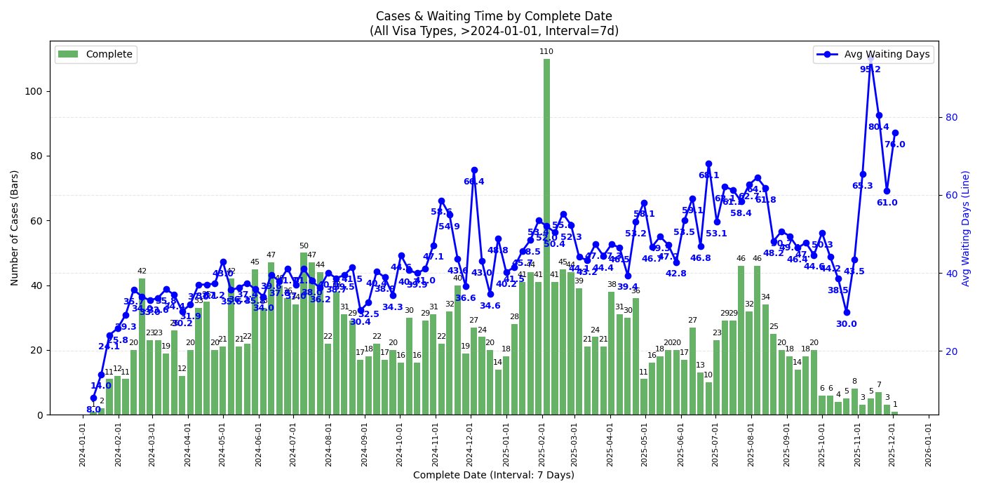plt.title(f'Cases & Waiting Time by {group_name}\n({visa_label}, >{START_DATE}, Interval={INTERVAL_DAYS}d)')