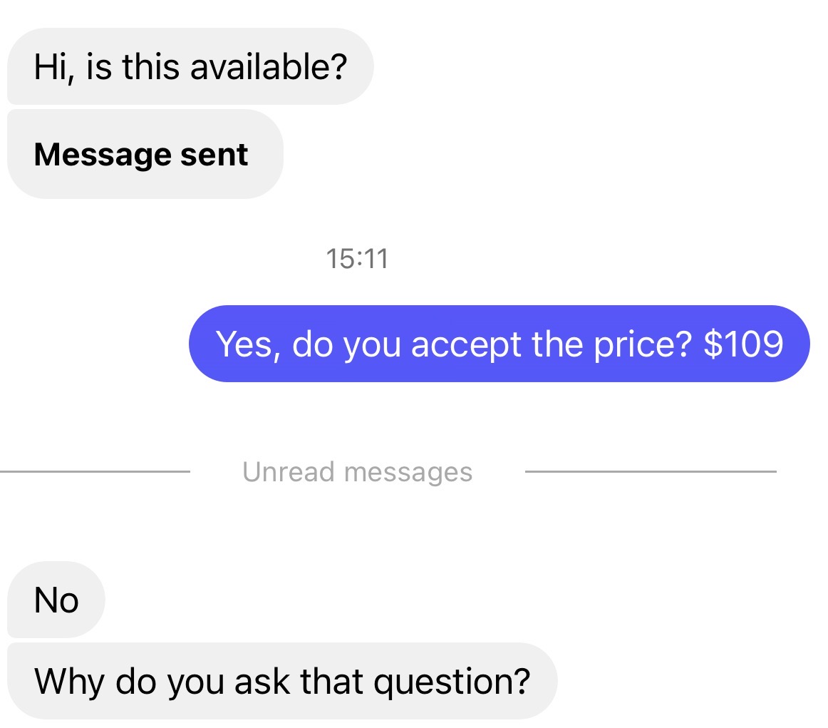- 买家的 profile,谈吐,问价可以让你大致判断要不要需要聊下去。一些个人觉得的 red flag:砍价过于离谱(市场价 500,上来就问 200 的),评分过低(3.0 以下),坚持用 zelle/venmo 的,超过 2 天不回复的,单方面从不妥协的等等。遇到这些卖家,与其浪费时间聊下去,直接 move on 就行,不用花时间多回复一句话。