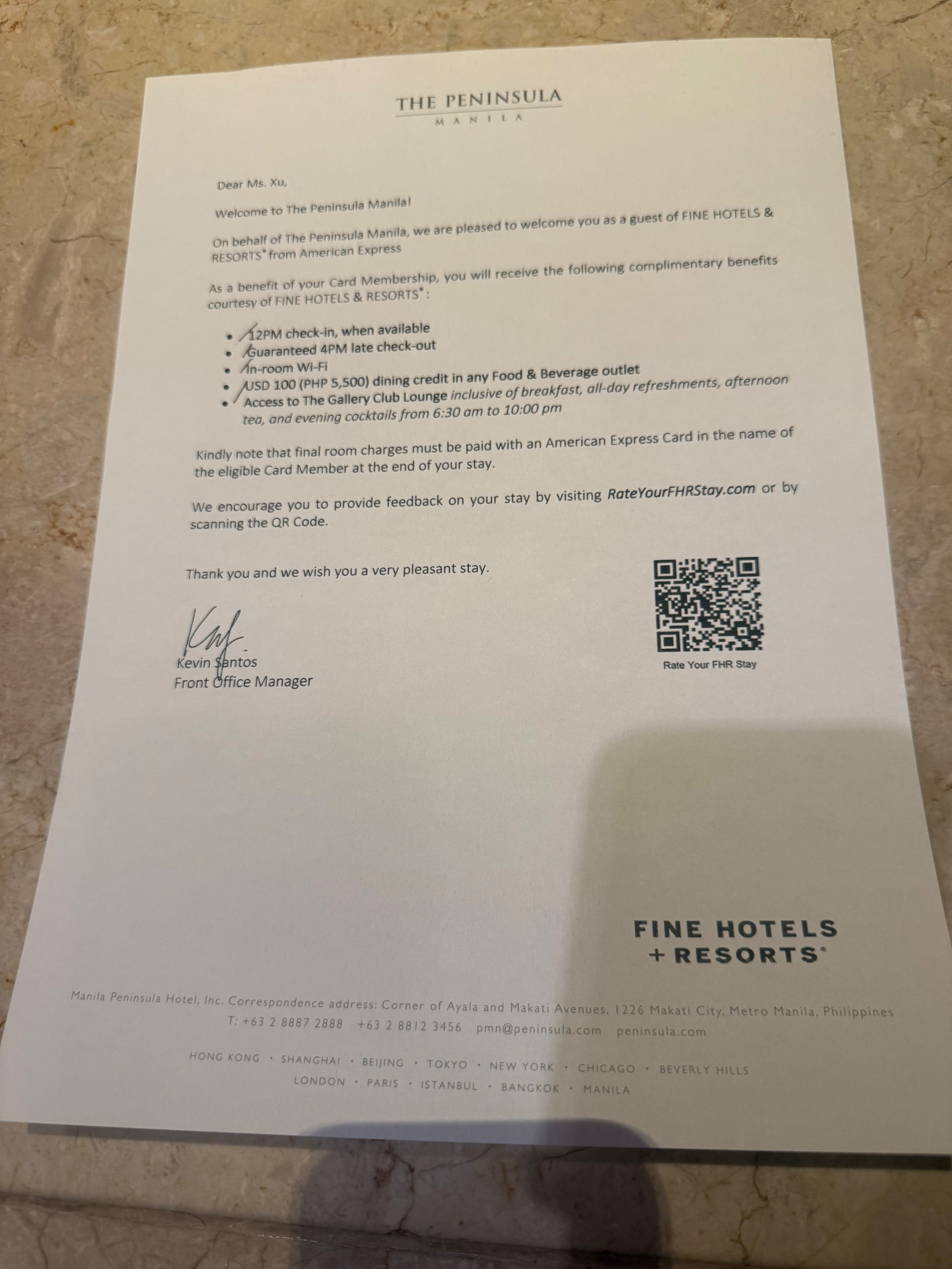 12月初入住菲律宾The Peninsula Manila,价格一晚$300出头,正好一个Amex credit的价格,用来消耗FHR credit非常合适