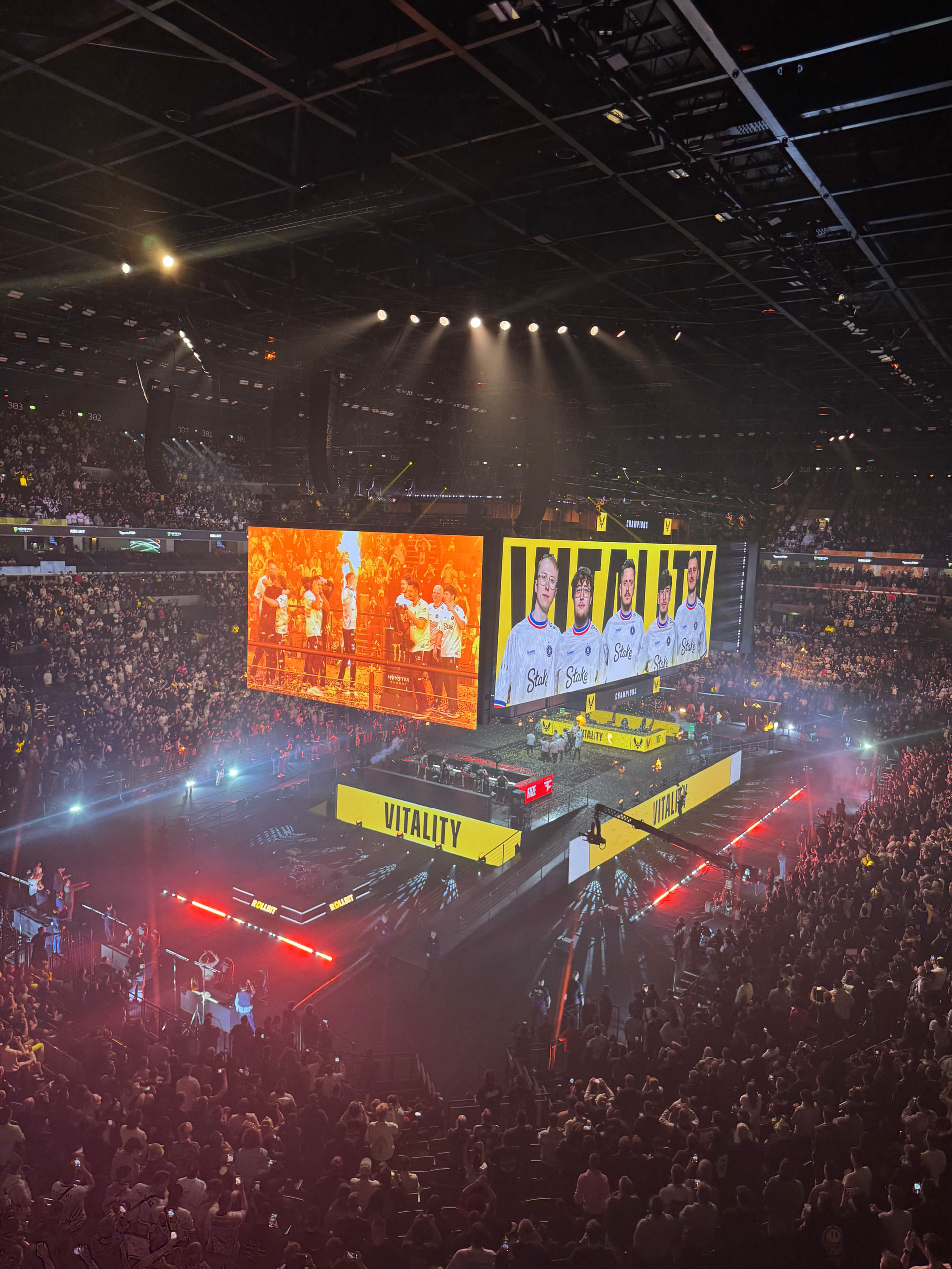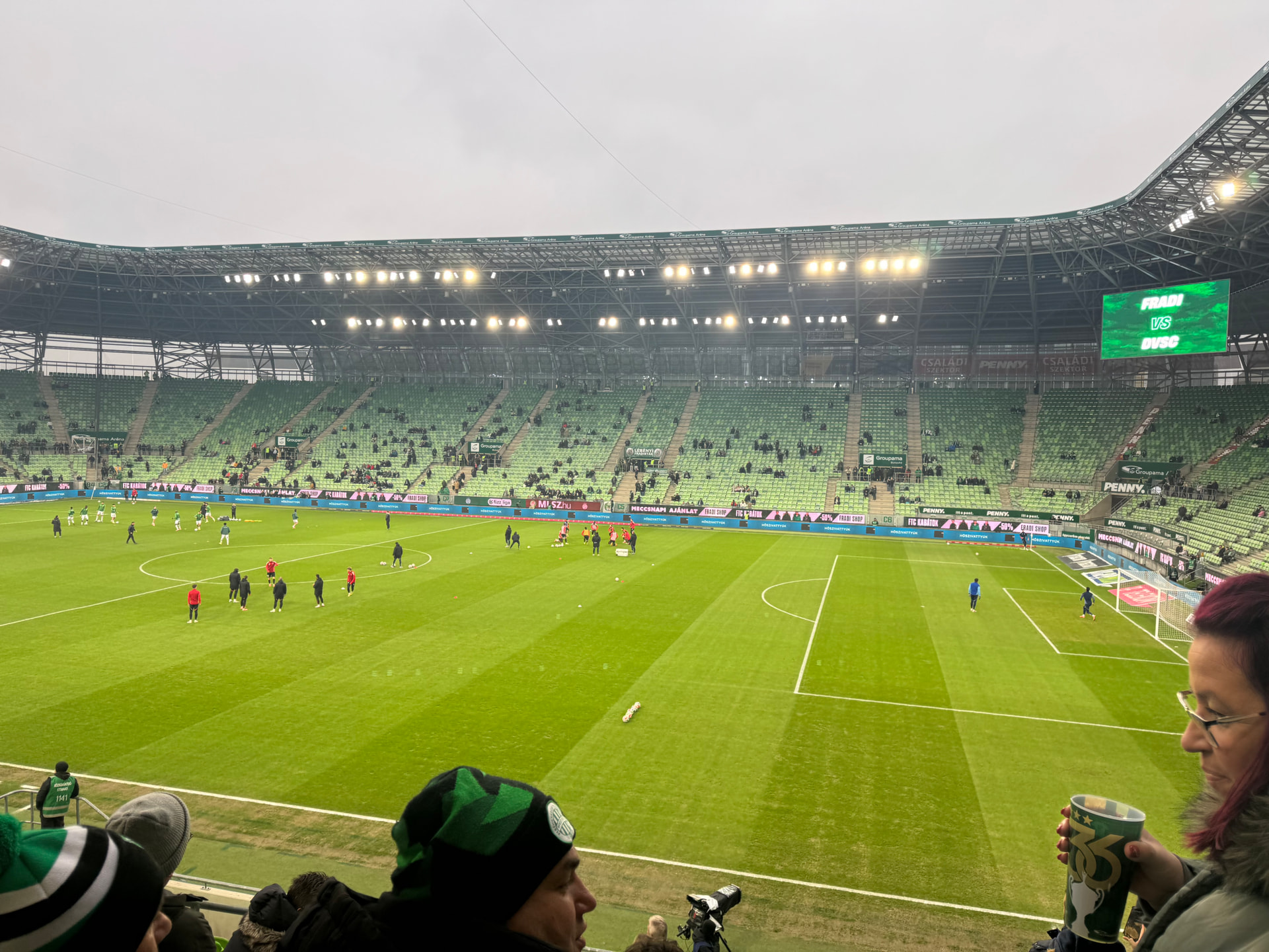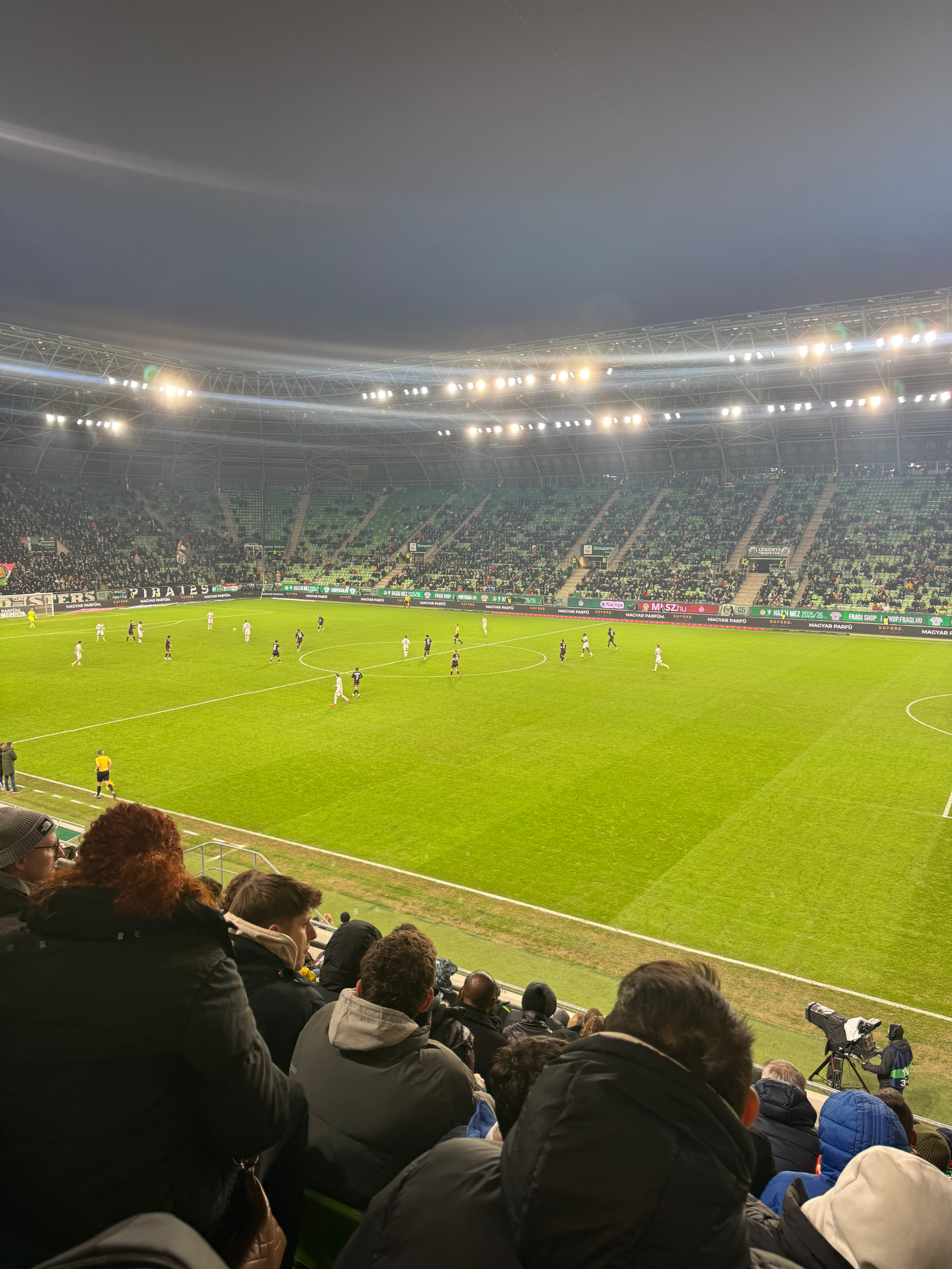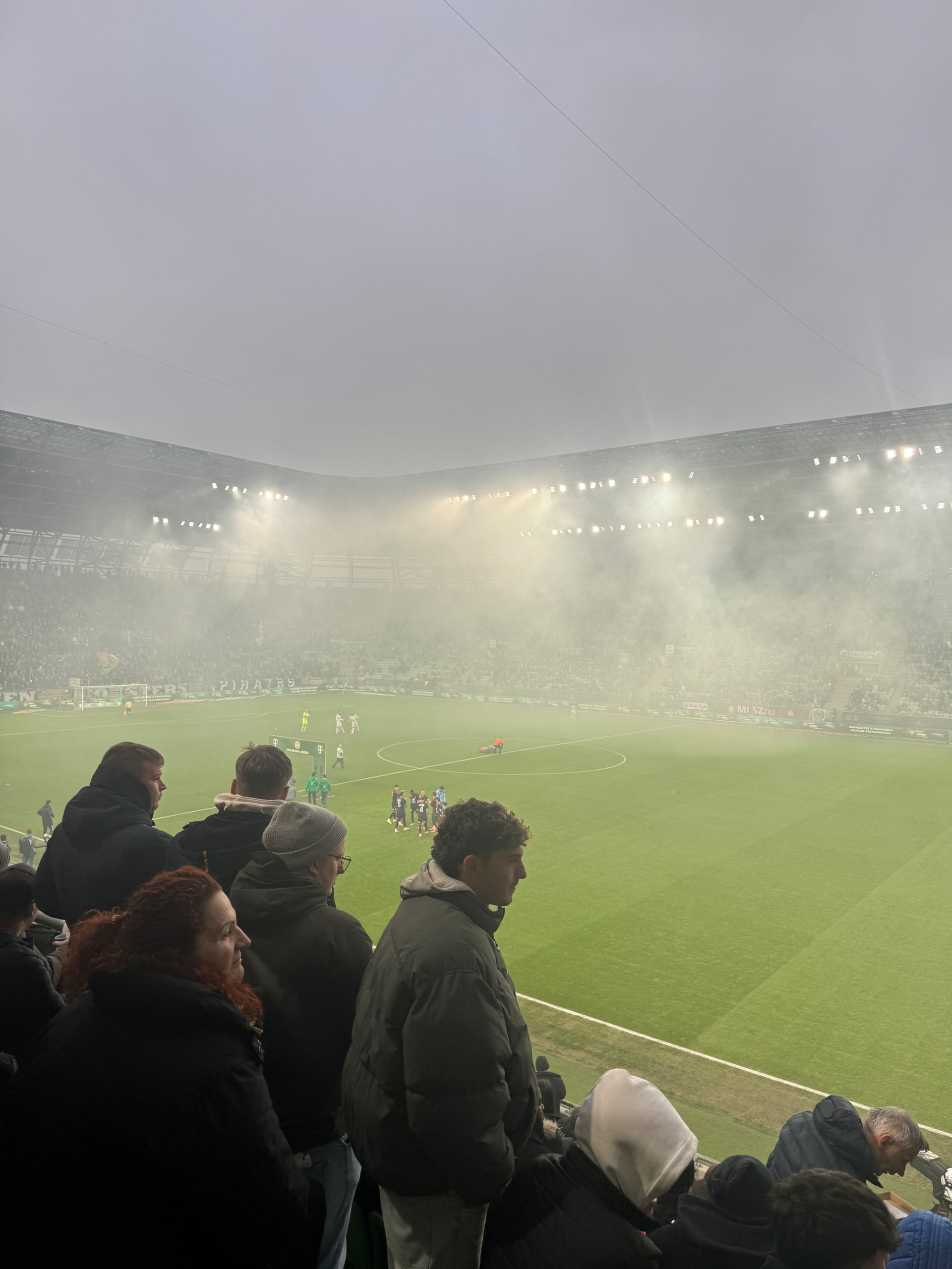 星期天下午的比赛,而且是对联赛第四距离自己只差三分的德布勒森,可能是因为天太冷,依然出现了大片大片的空座位,尤其是南看台主队球迷坐的简直稀稀拉拉,23700容量的大城市豪门球场上座率这么惨淡,甚至不如隔壁手球馆里的CS2布达佩斯Major,哥伦布机员这种小城市球场都坐满了!也许也能看出来为什么匈牙利足球现在这么烂了。
