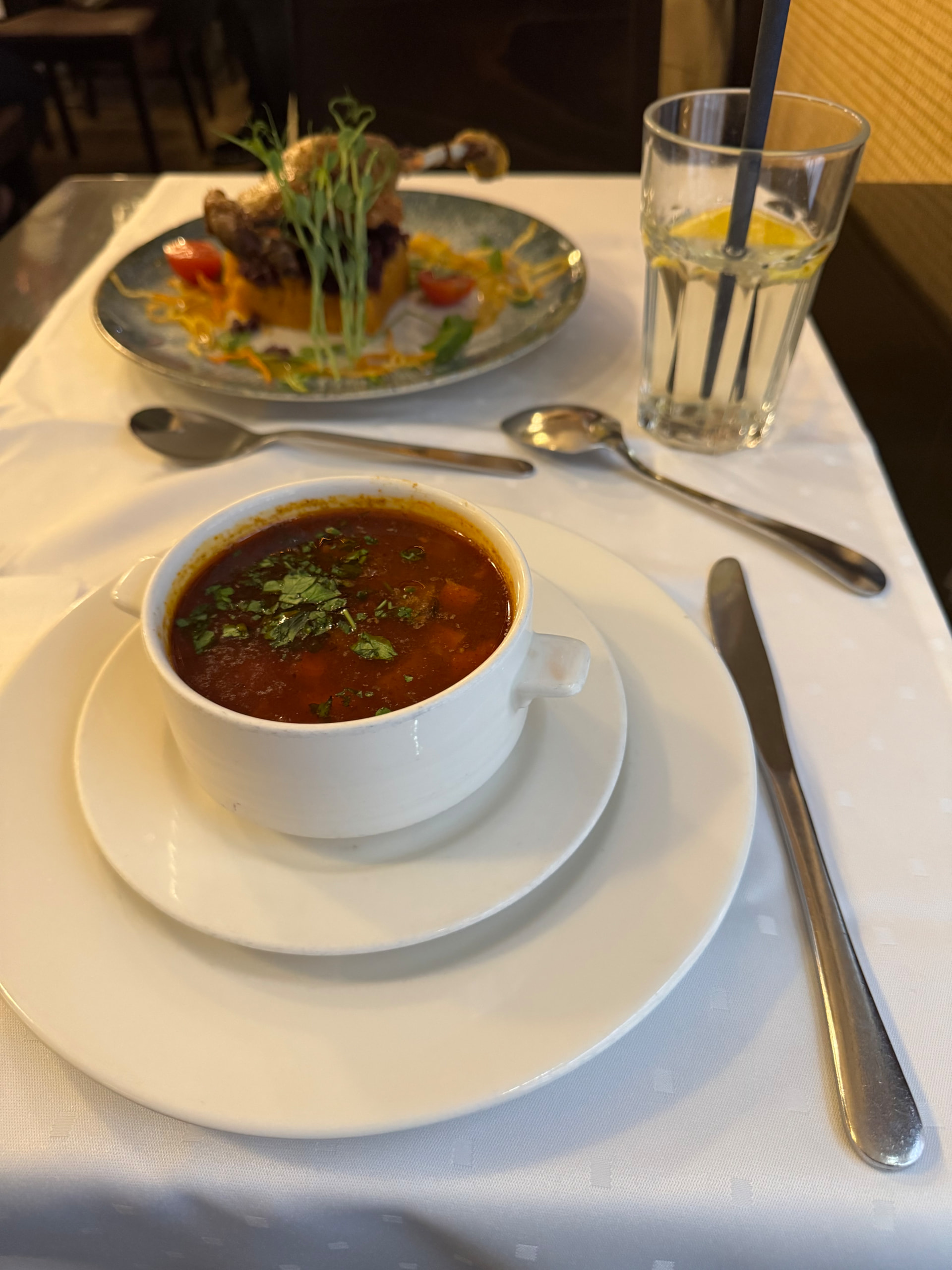 在万能的reddit的指导下中午找了这家叫做Ruben Étterem的中高端匈牙利菜餐馆,点的是古拉什牛肉汤和鸭腿,个人觉得牛肉汤好喝一点,但正不正宗也不知道,不过既然看到餐馆里来了不少匈牙利本地人那我就当它正宗吧。两个菜加一杯饮料是大概8000 HUF,默认12%小费。
