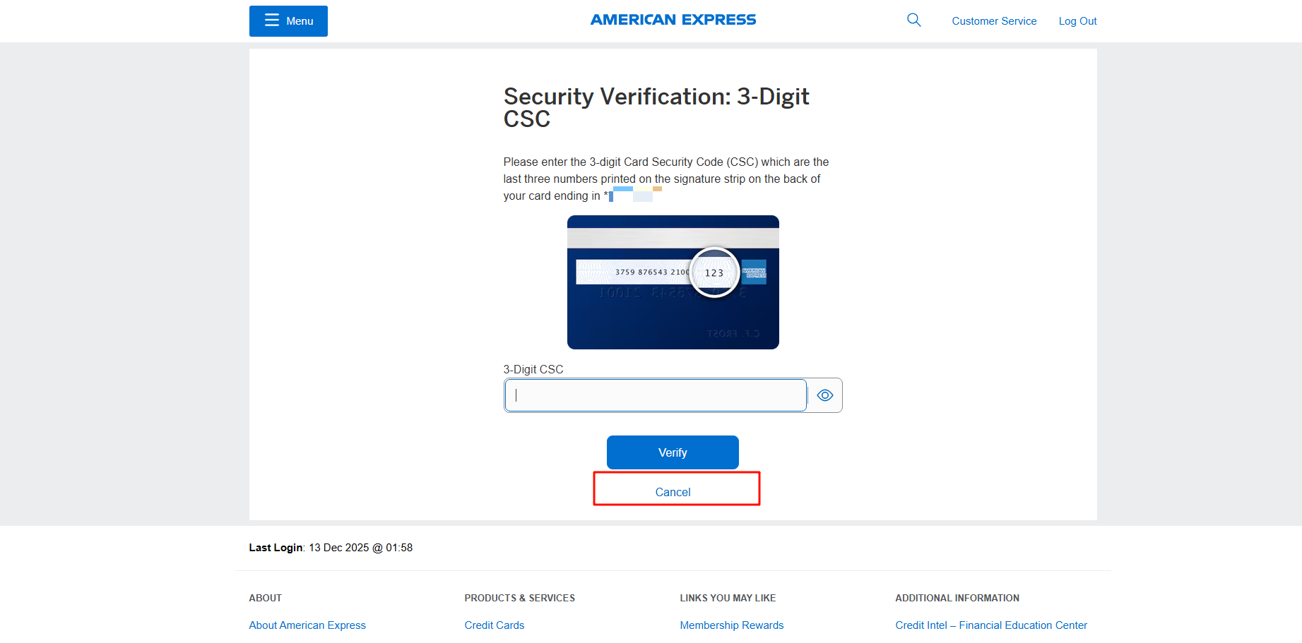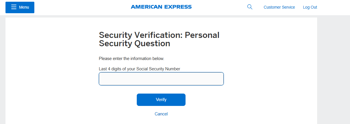 新开网页,进入 https://global.americanexpress.com/secure-messages 点击任意SM,会要求验证CSC,然后输入SSN后四位。验证通过后就能访问secure message