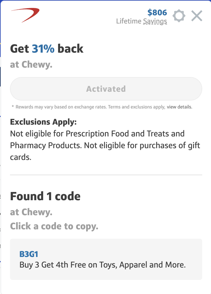 chewy 50%之外还刷出来paypal结账100给20gc 不知道是否是targeted
