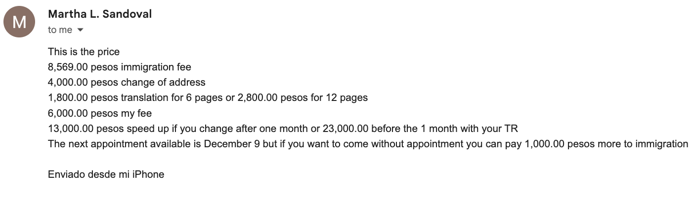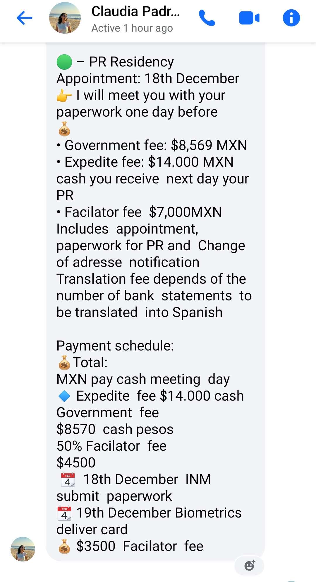 - 其实我还在Facebook找到了C, C也是Messenger联系,回复挺快的,她加急要14000,our fee 7000但是好像包括了改地址,也许比M更便宜3000MXN?但是C的DP不多