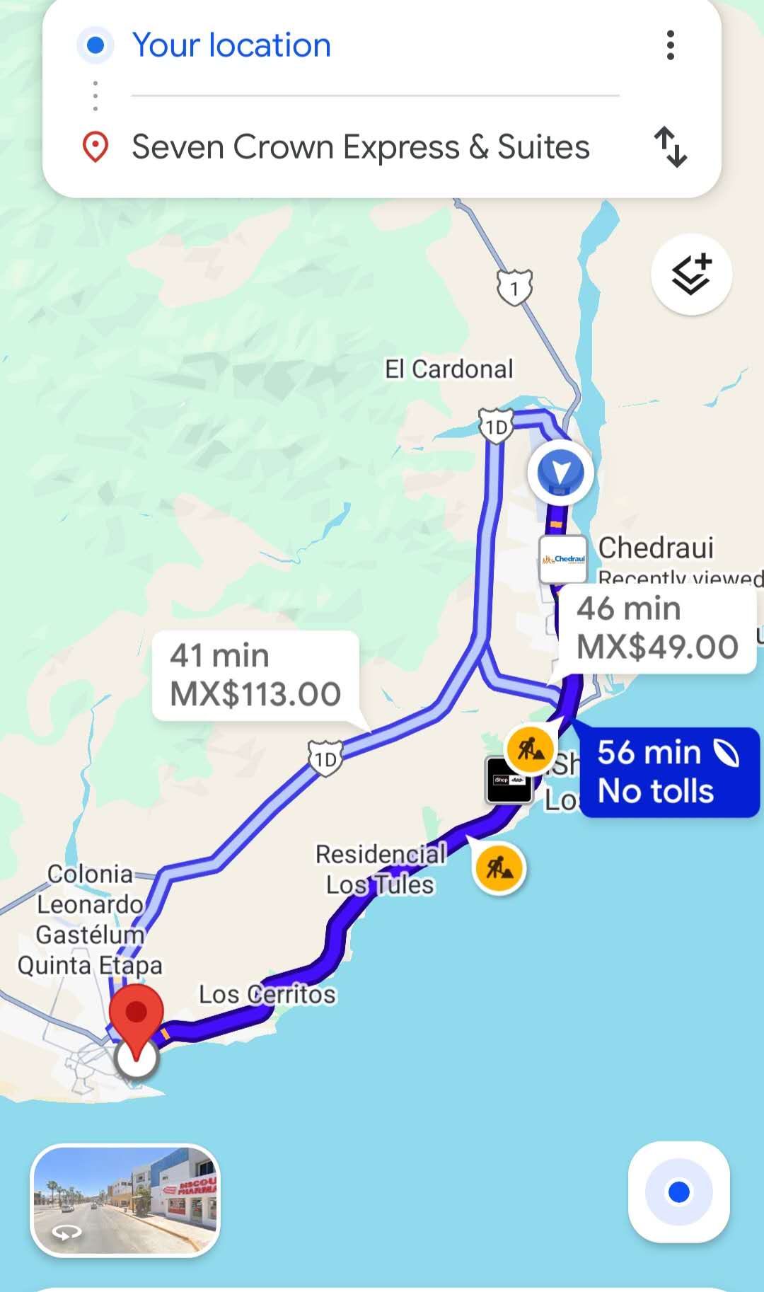 坐飞机到SJD机场,住Seven Crown Express & Suites by Kavia,然后最省钱的通勤方式是坐Bus,只要100比索,从机场直达酒店。上车Stop要走一会,下车Stop离酒店大概1分钟步行距离。另外这个酒店和M的办公室就在一起,具体如图: