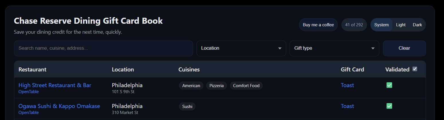 新增了筛选 “validated” 的选项,其中 validated 餐厅都是有 DP 验证可以报销的餐厅。总计41家。数据来源如下,credits go to DP providers!