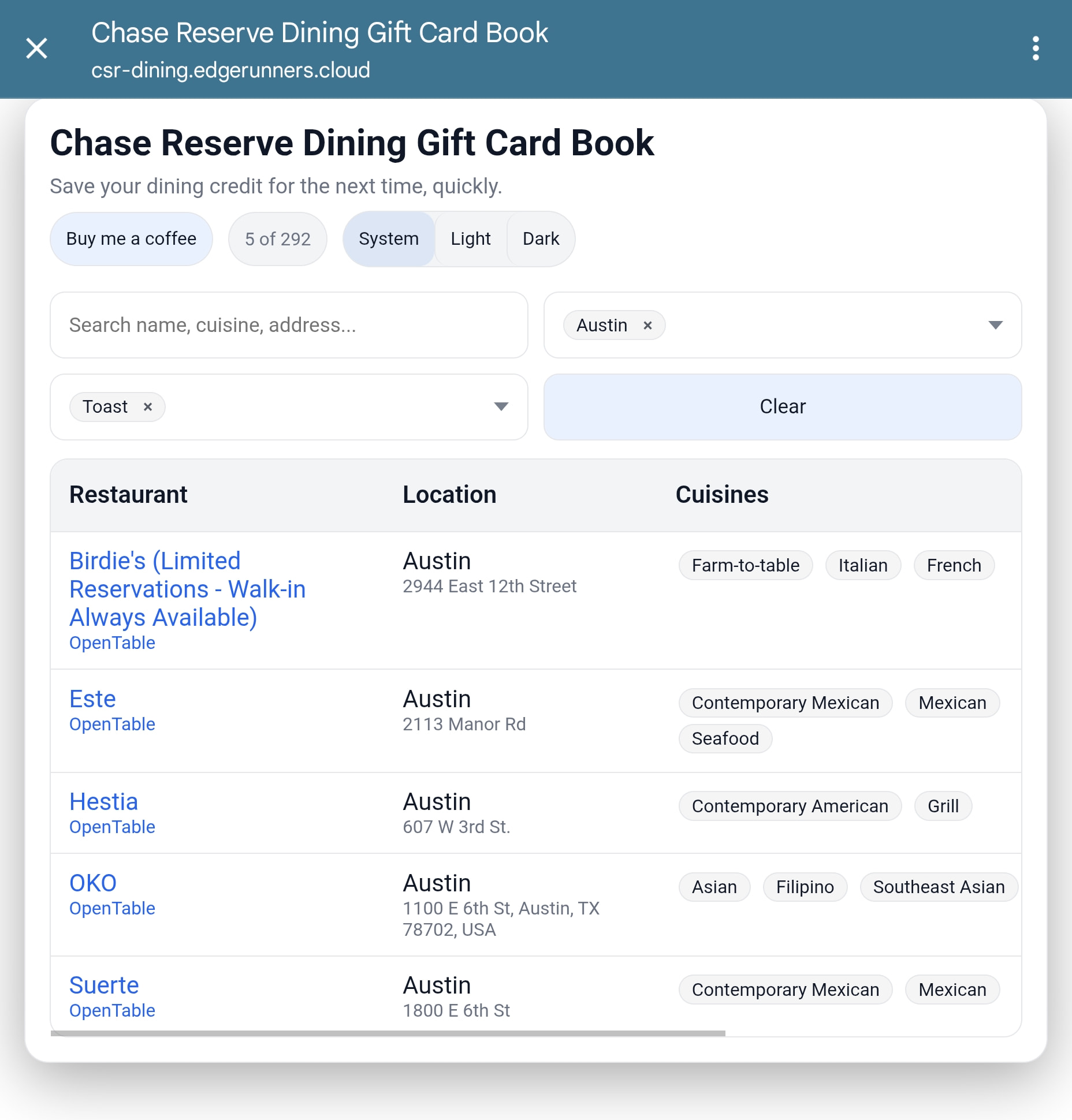 直奔主题:访问如下网站(我建的),选择 Gift type 为 toast,选择心仪的城市,点击 Toast 链接进入该餐厅的 Toast Tab Gift Card 网站,购买,等 CSR 报销,结束。