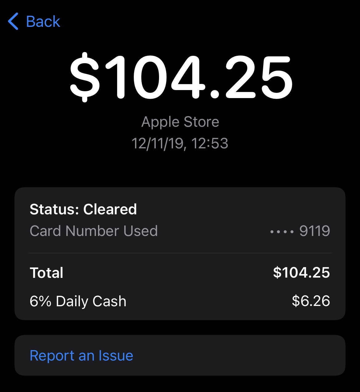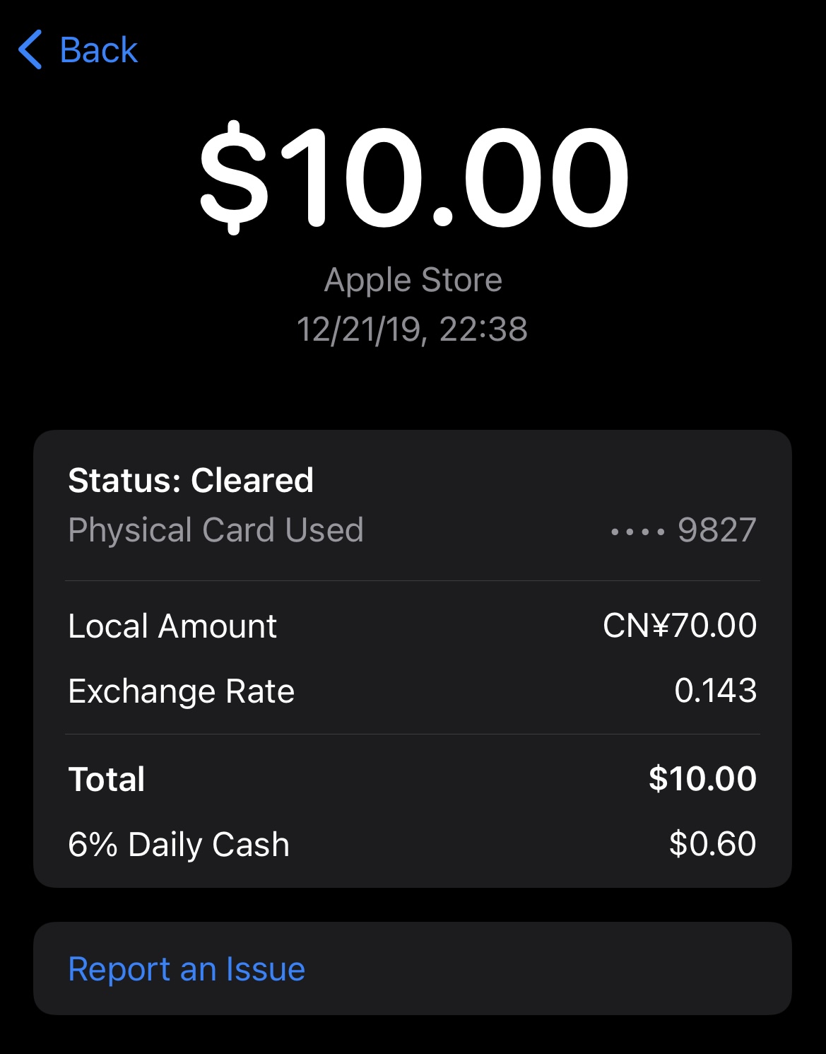 2019年底,我用 Apple Card 实体卡在中国杭州 Apple Store 买苹果配件是有3%的(当时有活动是2X,所以是6%)。