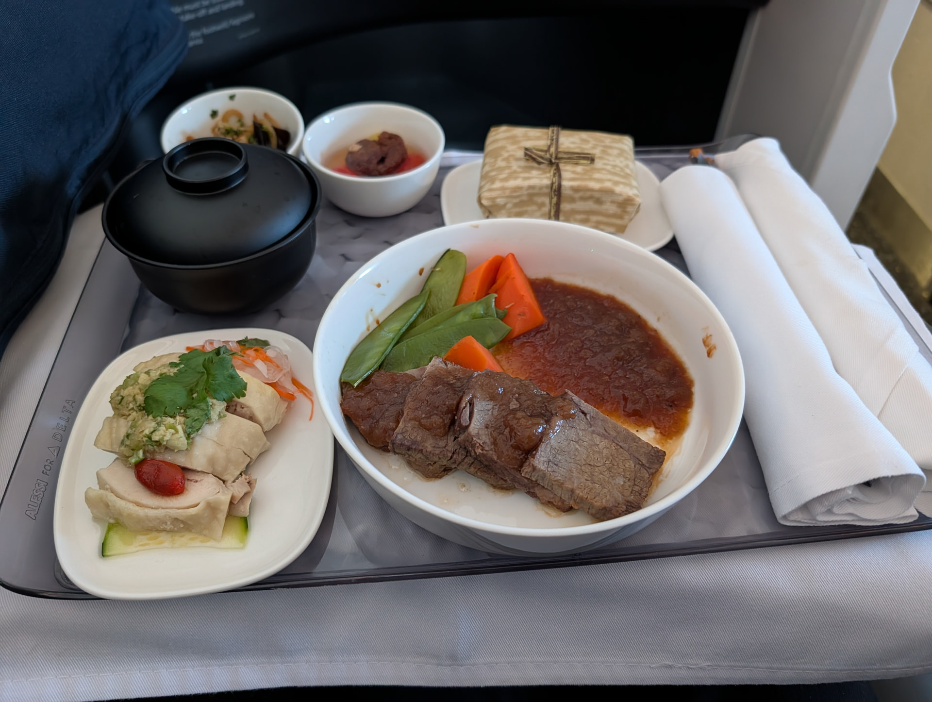 整个菜式看起来像是Delta把Seattle空厨买通了/菜刀架脖子上了,把JL/SQ/BR等一众亚洲航司的商务舱菜谱全偷来,缝合出了这么个好吃的Delta One餐食