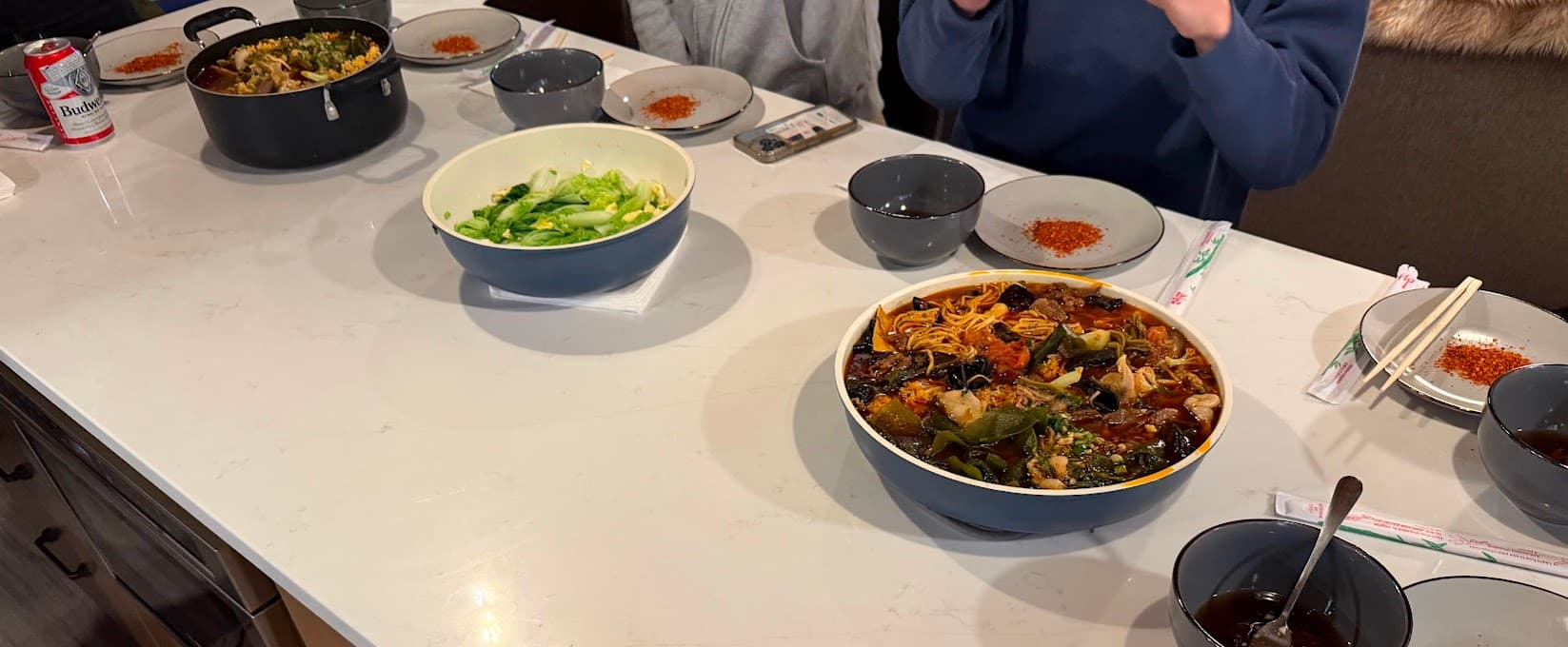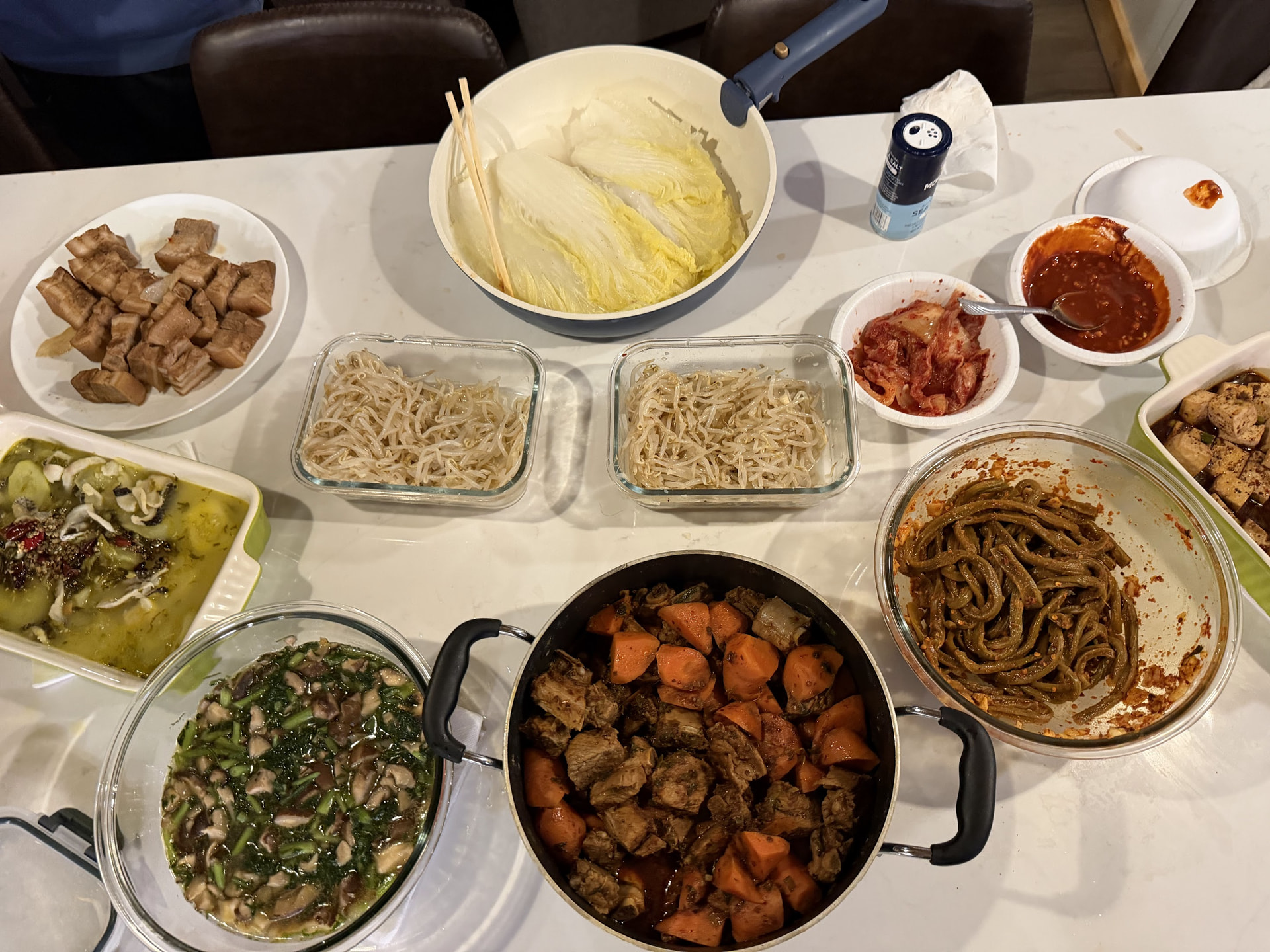 到了预定的房间,很是宽敞,三室三卫,客厅厨房一应俱全。小伙伴煮起了火锅冒菜,天冷了吃起来还是很满足。