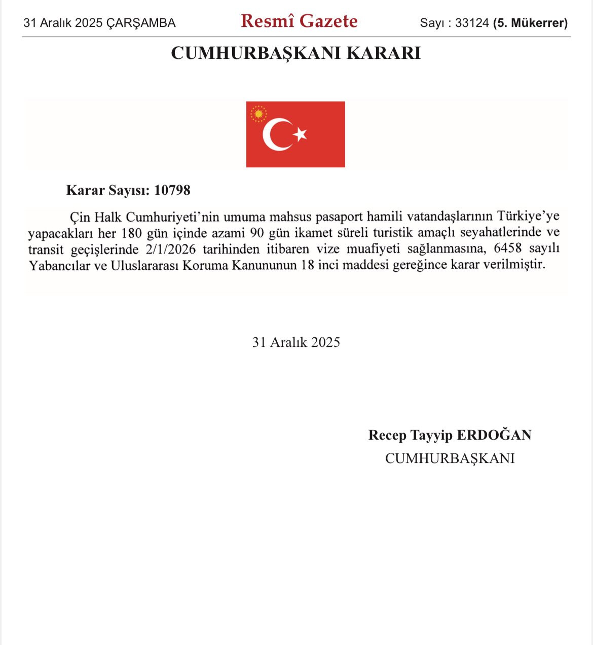 感谢 @Ford 提醒,今天土耳其总统府发布公告,2026年1月2日起对中国护照免签90天