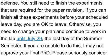 我自己的真实案例给你参考,答辩前已经有3篇一作。当时有一篇帮师妹做的文章(基本上全程是我帮做),我不是一作已经在返修,差最后一点实验。同时还被老板逼着开了几个项目给他申请grant。答辩前收到full time offer,遂告知老板想要走的leave data(summer学期结束前)。老板10分钟后发来这样的邮件。